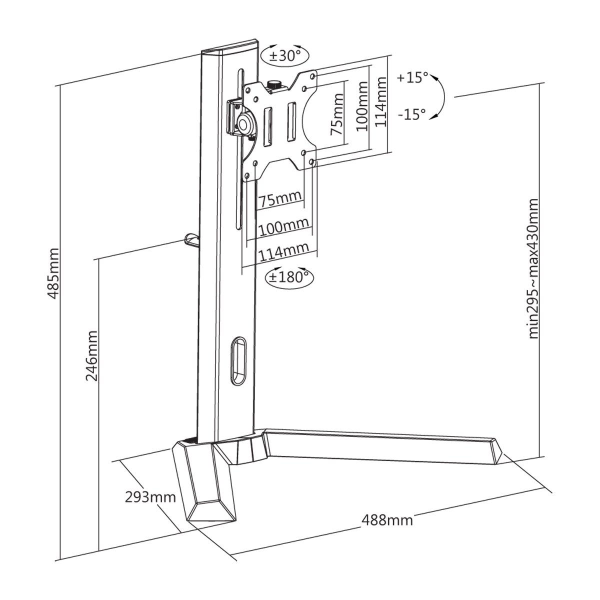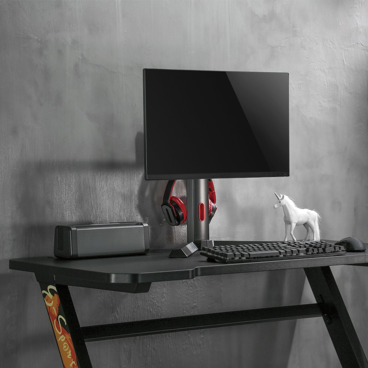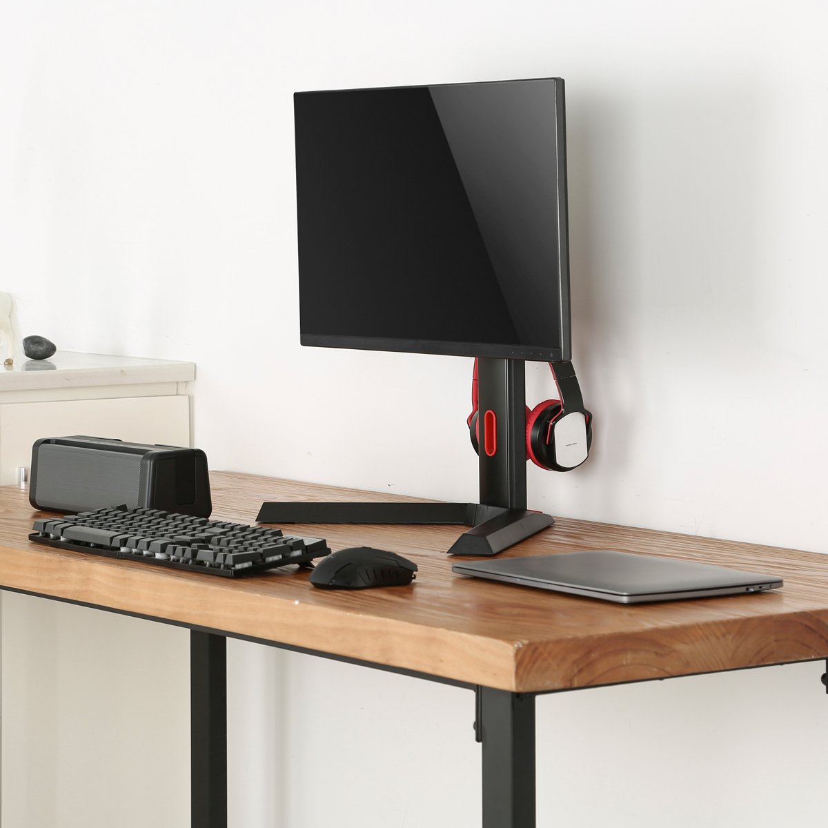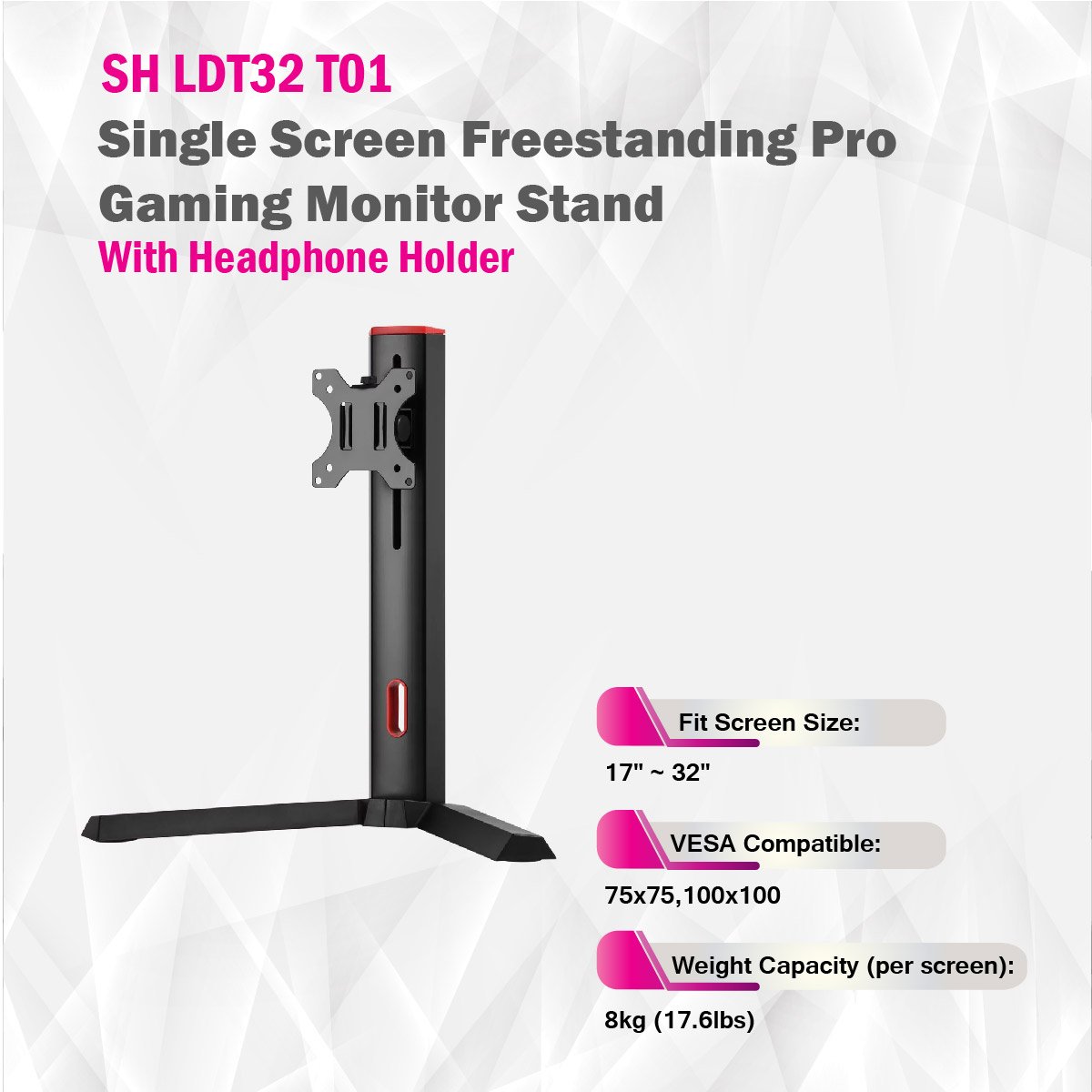 The SH LDT32 T01 is a high-performance Single Screen Freestanding Pro Gaming Monitor Arm Stand, catering to the needs of avid gamers with its thoughtful design and robust features. Crafted from a combination of steel, aluminum, and plastic materials, the stand boasts a sleek matte black & black or matte black & red powder coating for a stylish finish. With dimensions of 488x300x485mm (19.2"x11.8"x19.1"), it accommodates monitors ranging from 17" to 32", including curved models. The stand supports a weight capacity of 8kg (17.6lbs) per screen and is VESA compatible with 75x75 and 100x100 configurations. Its versatile design allows for a tilt range of +15° to -15°, swivel range of +30° to -30°, and a screen rotation of +180° to -180°, providing gamers with optimal viewing angles. The stand features a dedicated pole height of 485mm (19.1"), enhancing stability. Installation is a breeze with the freestanding design, and the quick-release VESA plate facilitates easy monitor adjustments. Cable management is incorporated for a tidy gaming setup. Additionally, the stand includes a headphone holder, adding convenience for gamers. The accessory kit is packaged in a normal/ziplock polybag or compartment polybag, offering a comprehensive solution for pro gaming monitor support