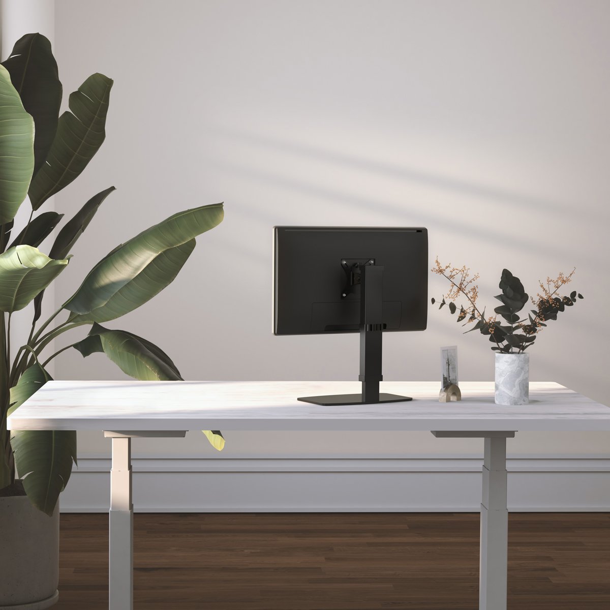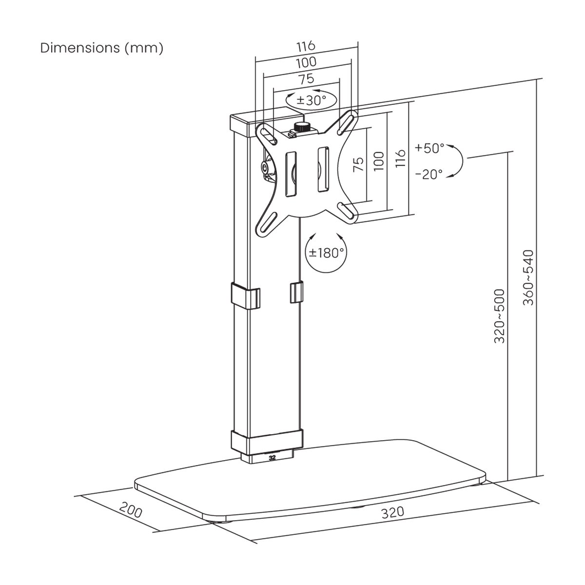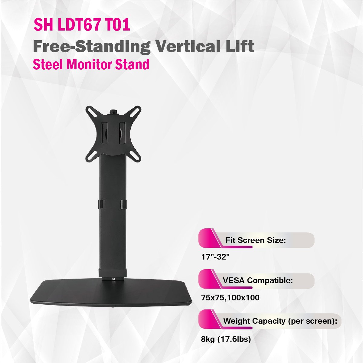 The SH LDT67 T01 is a Free-Standing Vertical Lift Steel Monitor Mount Stand designed for standard monitor setups. Crafted from durable steel and plastic materials with a sleek matte black or matte white powder coating, this stand offers a modern aesthetic. The stand accommodates one monitor in the 17"-32" size range, with a weight capacity of 8kg per screen. It is VESA compatible with 75x75 and 100x100 configurations, providing flexibility in monitor placement. The stand features a tilt range of +50° to -20°, swivel range of +30° to -30°, and a screen rotation of +180° to -180°, allowing users to achieve optimal viewing angles. Installation is hassle-free with a freestanding design, and the quick-release VESA plate facilitates easy monitor attachment and removal. Additionally, cable management is incorporated for a tidy workspace. While lacking USB or multi-media ports, the stand is a practical and efficient solution for users seeking a reliable and adjustable monitor mounting option in a standard setting. The accessory kit comes in a normal/ziplock polybag or compartment polybag, and the stand can be silkscreen printed for customization. Please note that anti-theft features and a direction indicator are not included in this model