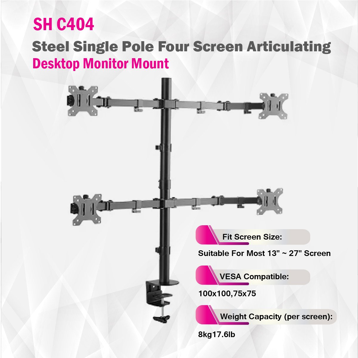 The SH C404 is an upgraded monitor arm, which double-joint can be tightened, so you can adjust exactly how stationary you want everything to be. Constructed of high-grade steel, this rugged mount is built to resist scratches and supports screens up to 8kg/17.6 lbs and 32" in size. We made a detachable VESA panel, just simply screw the monitor on the panel and slide it back to the mount. Full motion structure allows smooth, effortless rotating and positioning for any direction, making it easy to find the perfect viewing angle. You can also adjust the monitor height vertically to a desired position. Besides, a cable clip is included for keeping cables organized and protected. Please refer to the product diagram for further details.