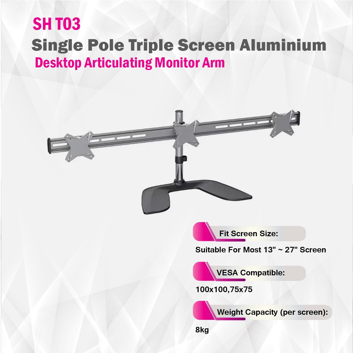 The SH T03 is an economical and space-saving single-pole triple-screen aluminium desktop articulating monitor arm designed to improve your workstation's efficiency. With a sleek matte black powder-coated finish, this monitor arm offers both durability and a modern appearance.It can accommodate three screens ranging from 13" to 27" in size, making it suitable for a variety of setups. Each monitor arm has a weight capacity of up to 8kg, ensuring that your monitors are securely supported. The VESA compatibility with 100x100 and 75x75 mounting patterns ensures that it can be used with a wide range of monitors.The articulating design allows for a +15° to -15° tilt range, 360° screen rotation, and quick-release VESA plates for easy adjustments and screen installation. Additionally, cable management features help keep your workspace organized and free from cable clutter. The monitor arm is designed for tabletop base installation and comes with a pole height of 375mm.With its economical pricing, sturdy construction, and essential ergonomic features, the SH T03 is an ideal choice for those looking to optimize their multi-screen setup without compromising on workspace organization and flexibility