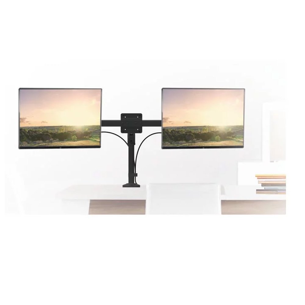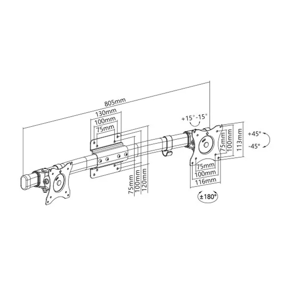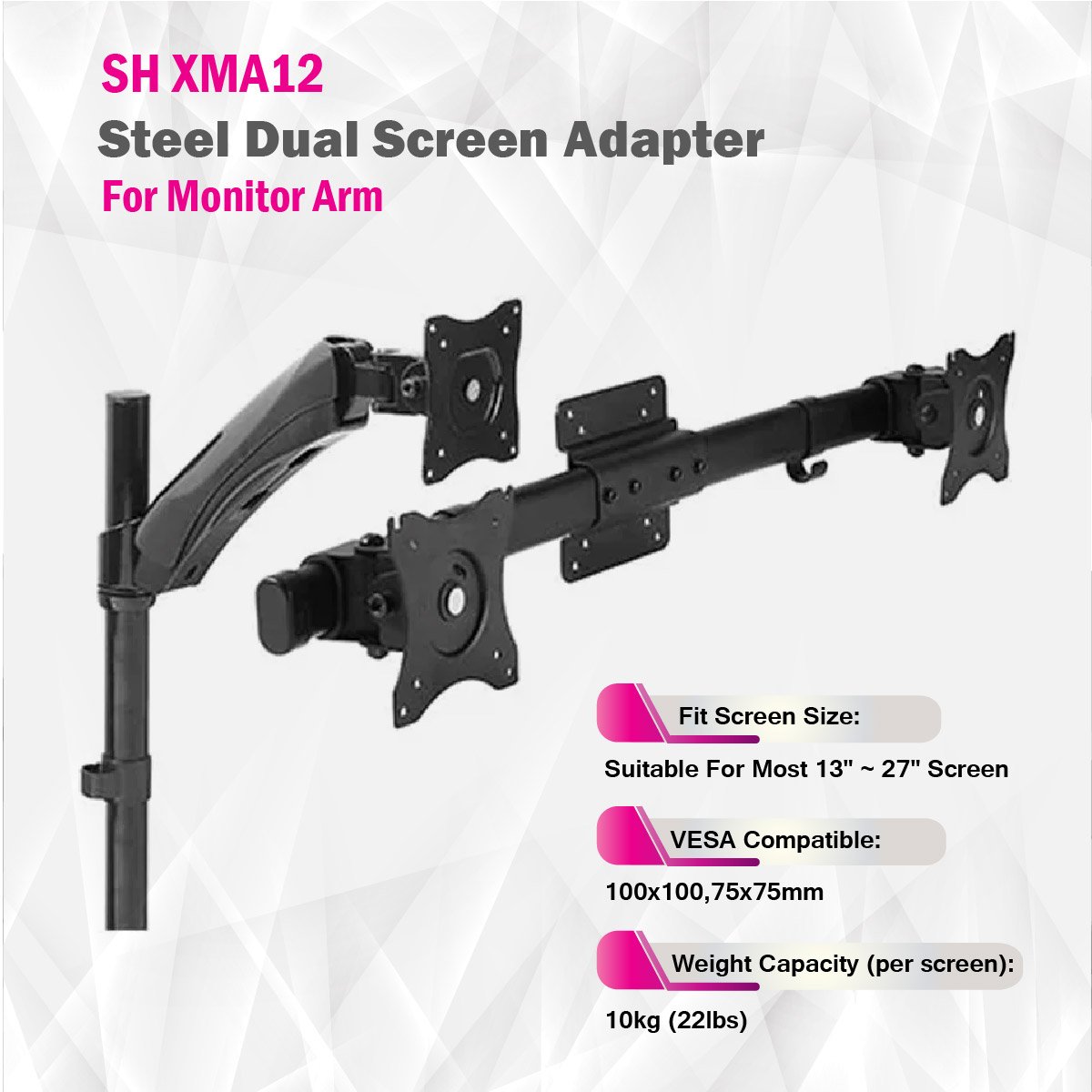The SH XMA12 Steel Dual Screen Adapter is a standard-ranked monitor arm component designed to enhance your workstation setup. Crafted from durable steel and finished with a matte black powder coating, it offers both strength and an attractive appearance. With dimensions of 805x120x135mm (31.7"x4.7"x5.3"), it is compatible with most 13" to 27" screens, providing a versatile solution for mounting dual monitors.This dual screen adapter can support a weight capacity of up to 10kg (22lbs) per screen, ensuring secure and stable placement for your monitors. It is compatible with VESA standards of 100x100mm and 75x75mm, allowing for easy and secure attachment of your screens. The adapter offers a range of adjustable features, including tilt from +45° to -45°, swivel from +15° to -15°, and screen rotation of +180° to -180°, enabling you to achieve the perfect viewing angle.