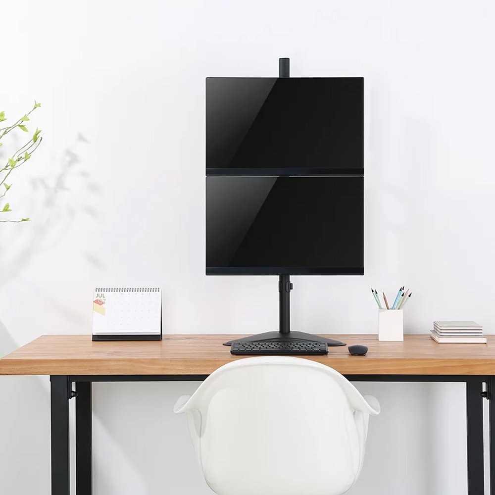 The SH 120T02V is an Economy Series vertical dual-monitor steel articulating desktop stand designed to enhance your workstation's efficiency. Constructed from sturdy steel with a matte black powder-coated finish, this desktop stand is not only durable but also adds a sleek and modern touch to your workspace.This stand is compatible with most 13" to 32" screens and can support two monitors simultaneously, with each screen having a weight capacity of up to 8kg. It features VESA compatibility for 75x75mm and 100x100mm mounting patterns, allowing you to mount a variety of monitors securely.You can easily customize your dual-monitor setup to suit your preferences with a range of adjustments. The stand offers a tilt range of +45° to -45°, a swivel range of +45° to -45°, and full 180° screen rotation, enabling you to find the perfect viewing angles and orientations for your monitors.Installation is hassle-free, as it's a freestanding design, eliminating the need for clamps or grommets. The stand's pole has a height of 905mm, providing ample space for your monitors. Cable management features help you keep your desk tidy and organized, and the included instruction manual makes setup straightforward.The SH 120T02V is an economical solution for users seeking an efficient and adjustable dual-monitor setup with the flexibility to enhance their productivity and workspace organization.