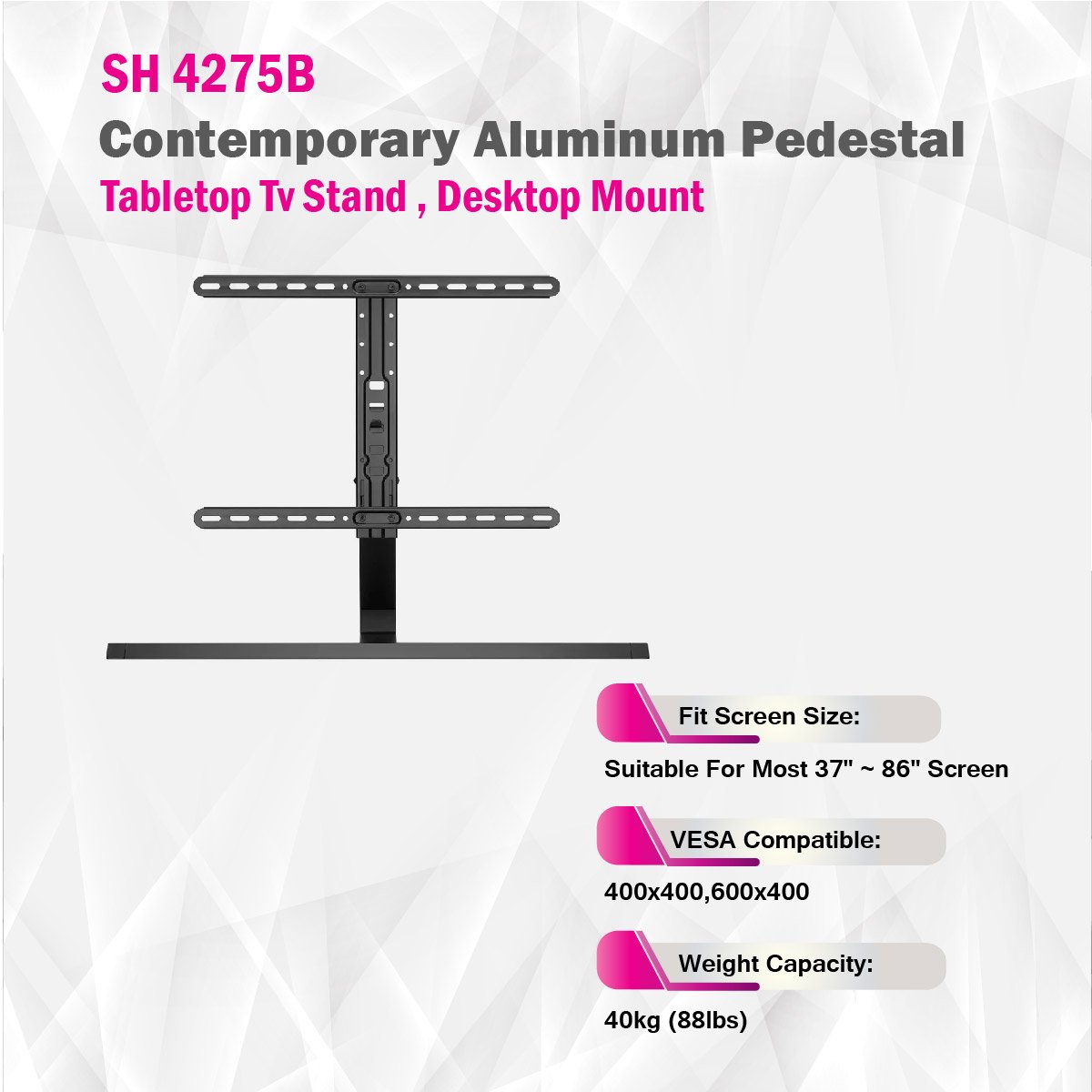 The SH 4275B is a premium-grade aluminum pedestal tabletop TV stand that combines contemporary design with functionality. This TV tabletop stand is constructed from high-quality aluminum, steel, and plastic materials, ensuring both durability and a modern aesthetic. With a sleek matte black and space grey color scheme, it complements your home entertainment setup elegantly.Designed to accommodate a wide range of television sizes, it is suitable for most 37-inch to 75-inch screens, including curved TVs. The stand is VESA compatible, supporting various mounting patterns, such as 200x200, 300x200, 300x300, 400x200, 400x300, 400x400, and 600x400, offering versatility in TV compatibility.With a weight capacity of 40kg (88lbs), this TV stand provides a stable and secure platform for your TV. What sets it apart is its adjustable TV height range, allowing you to choose from multiple height options ranging from 585mm to 735mm (23" to 28.9"), ensuring the perfect viewing height for your setup