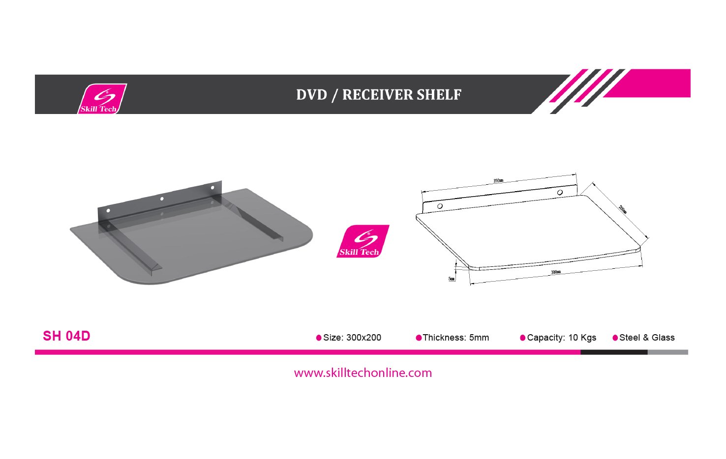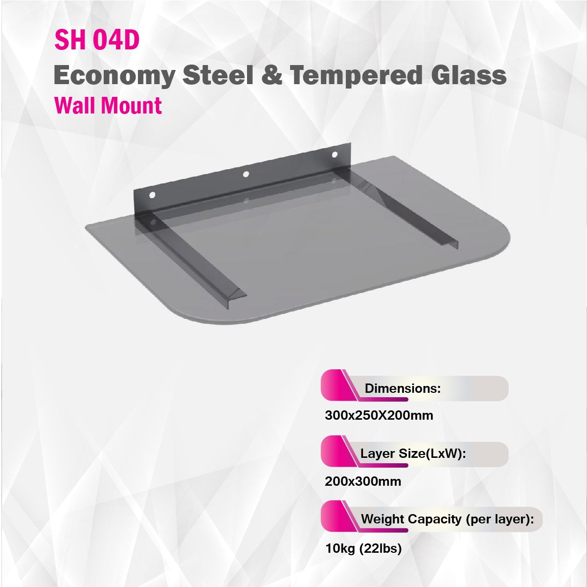 The SH 04D is a universal and simplistic wall mount single-deck shelf for DVD players/AV components that need to be located next to a mounted television. It can be mounted on concrete wall or stud wood wall, holding up to 10kgs with 5mm tempered glass shelf. The simplest construction allows easy installation and a neat look.