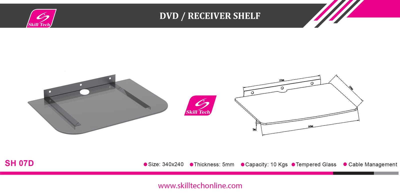 The SH 07D Economy Steel & Tempered Glass Wall Mount is a reliable choice for organizing your AV components or media players in a neat and space-efficient manner. Constructed with sturdy steel and tempered glass materials, this wall mount ensures durability and stability. The sleek black powder coating finish adds a touch of elegance to your entertainment area.The wall mount features a tempered glass shelf measuring 340x240x5mm, providing ample space for your media devices. Its single-layer design has a layer size of 240x340mm and a thickness of 5mm, capable of supporting a weight capacity of 10 kgs (22 lbs) per layer. Installation is made easy with its single stud mounting system, offering a secure and stable setup. With a profile height of 240mm, this wall mount keeps your AV components organized and easily accessible.