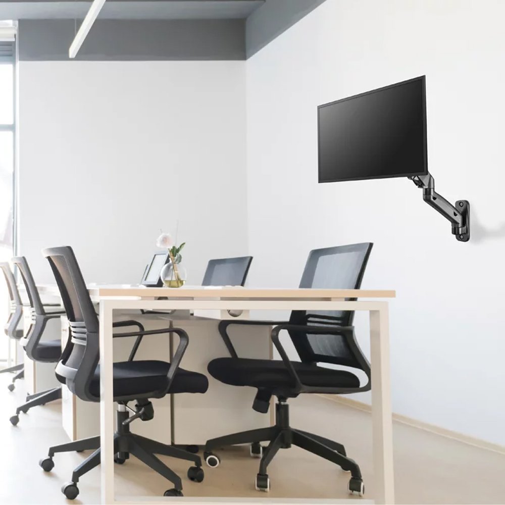 The SH W1011H is a versatile wall-mounted gas spring designed to enhance your monitor setup with flexibility and convenience. Its sleek matte black aluminum construction and powder coating give it a modern and stylish appearance. This mount is suitable for most 17" to 32" screens, including curved monitors, and supports a single screen with a weight capacity ranging from 2kg to 7kg (4.4lbs to 14.6lbs).It is VESA compatible with 75x75 and 100x100 mounting patterns, ensuring a secure and universal fit for various monitors. The gas spring mechanism allows for effortless adjustments, including a remarkable tilt range of +90° to -90°, a swivel range of +90° to -90°, and a screen rotation of +180° to -180°, giving you complete control over your monitor's positioning.With an arm full extension of 450mm (16.6"), you can easily extend or retract your monitor for the perfect viewing distance. Installation is straightforward with wall mounting, and the mount offers a profile ranging from 90mm to 540mm. Cable management is included to keep your setup organized and clutter-free. The SH W1011H is a practical accessory to optimize your monitor's ergonomics and create an efficient workspace.