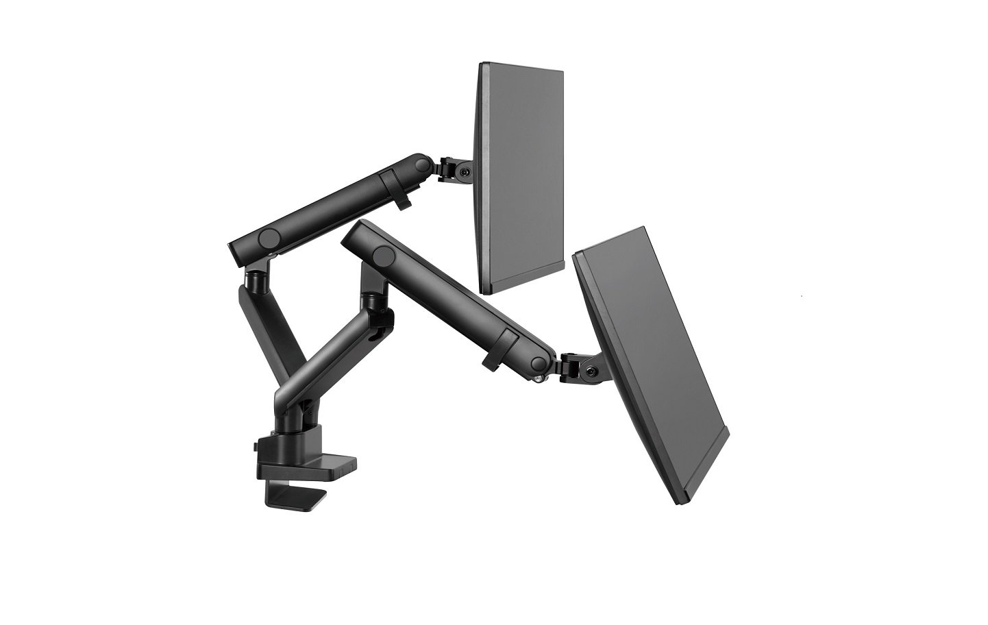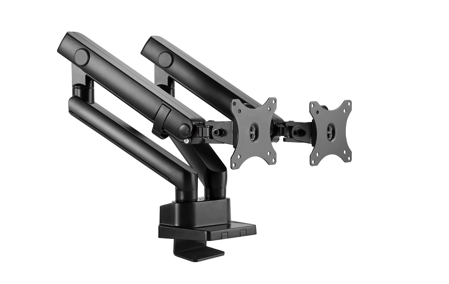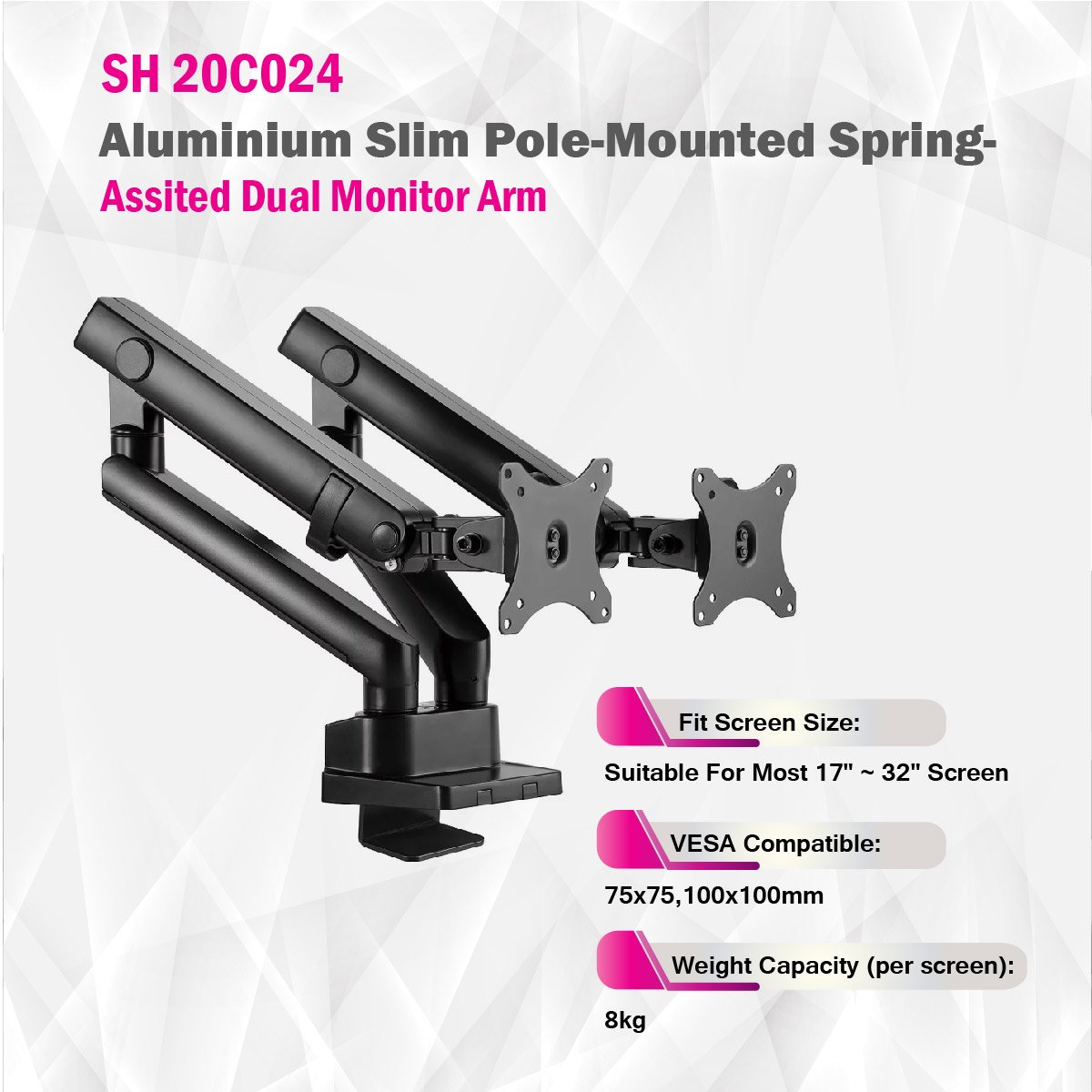 The SH 20C024 is a premium dual monitor arm designed to elevate your workspace and enhance your viewing experience. With its sleek matte black powder-coated finish and dimensions of 1044x129x523mm (41.1"x5.1"x20.6"), it's suitable for most 17" to 32" screens, including curved monitors. Crafted from a combination of aluminum, steel, and plastic materials, it offers robust support, with a weight capacity of 8kg per screen.This dual monitor arm is VESA compatible, accommodating both 75x75mm and 100x100mm patterns, ensuring secure and adaptable screen mounting. You can easily customize your viewing angles with its wide range of adjustments, including a tilt range of +90° to -90°, swivel capability of +90° to -90°, and full 90° screen rotation. The arm extends up to 467mm (18.4"), allowing you to position your monitors at the perfect distance for your comfort and productivity.Installation is straightforward with this pole-mounted monitor arm, and it provides a secure and space-saving solution. It's designed for dual monitors, making it ideal for multitasking and productivity. Whether you're working, gaming, or simply enjoying entertainment, the SH 20C024 dual monitor arm offers a premium and ergonomic solution to optimize your workspace and reduce strain during extended use.