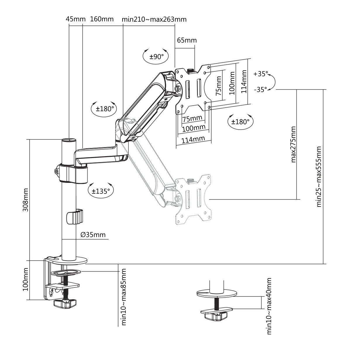 | Suggested Desktop Thickness: | Clamp:10~85mm Grommet:10~40mm (Clamp:0.39"~3.3" Grommet:0.39"~1.6") |