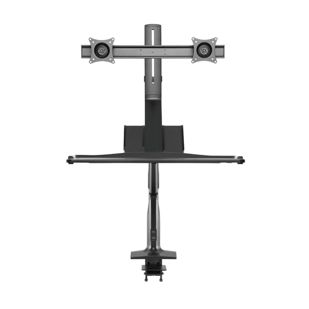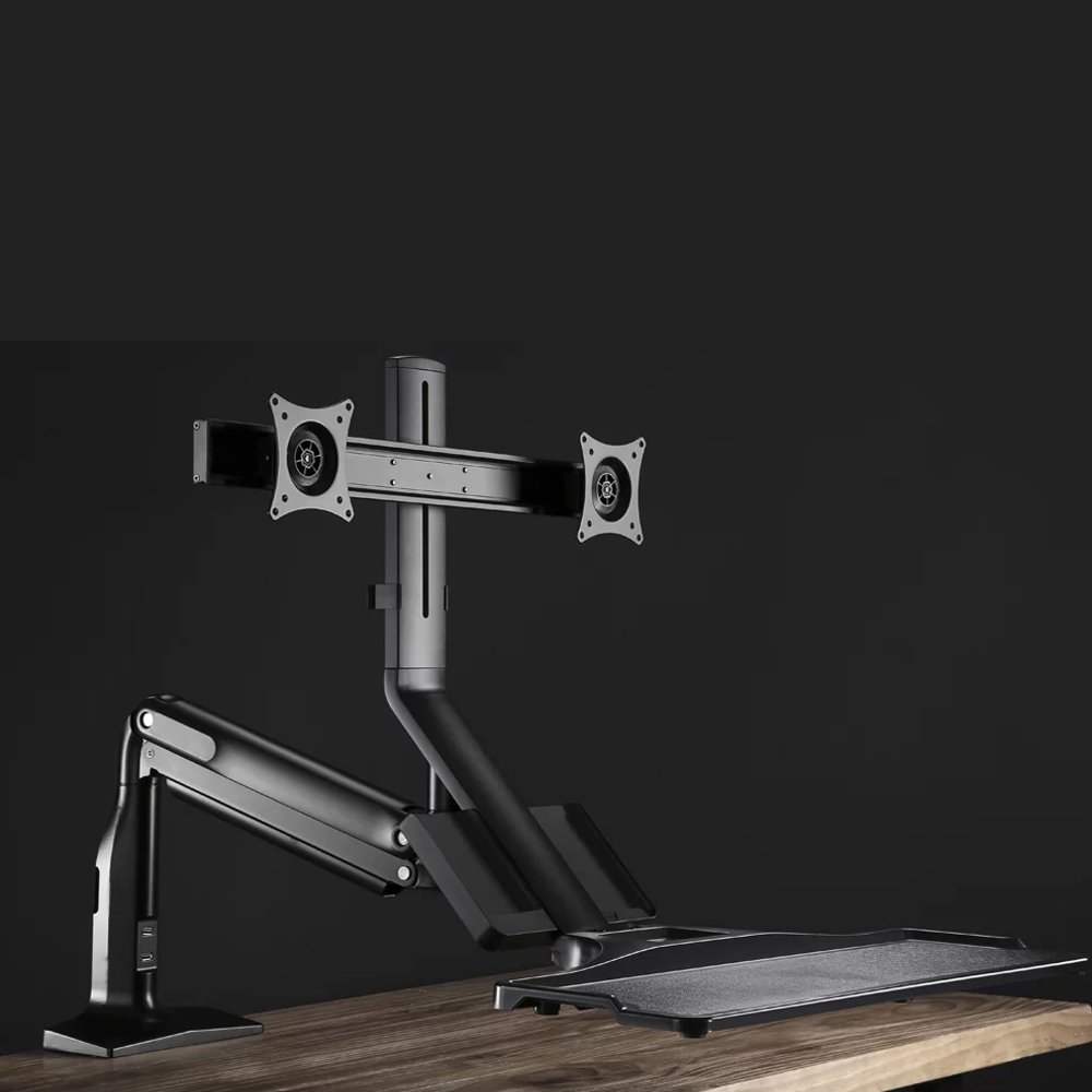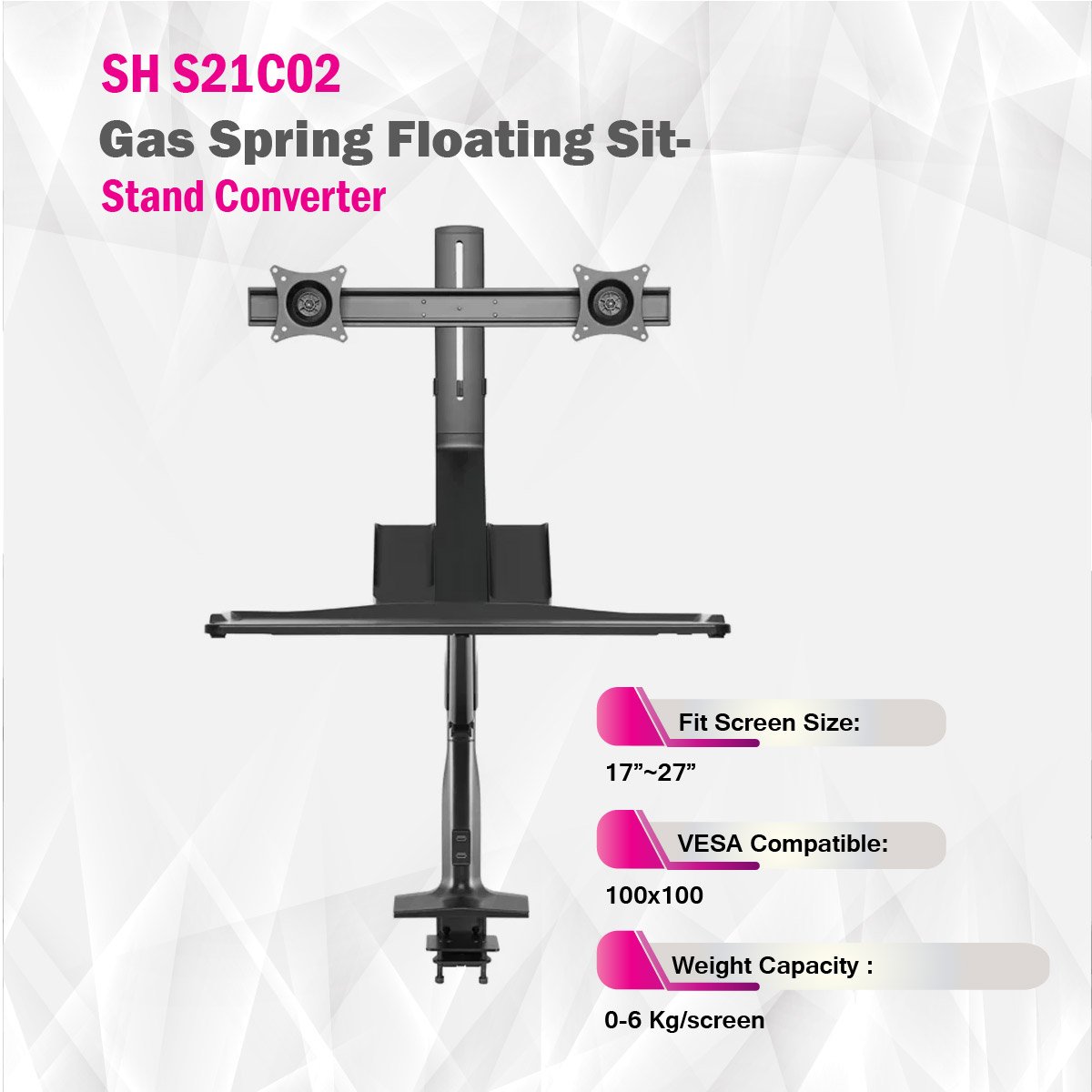 The SH S21C02 Gas Spring Floating Sit-Stand Converter Ergonomic Mount offers a versatile solution for improving workstation ergonomics. Designed as a gas spring monitor arm, it accommodates screen sizes ranging from 17" to 27" with ease and supports a weight capacity of 0-6kg per screen. With a VESA capacity of 100x100, it ensures compatibility with various monitors. Its swivel range of +10° to -10° and screen rotation capability of +180° to -180° allow for flexible positioning and viewing angles, enabling users to effortlessly switch between sitting and standing positions while maintaining optimal screen orientation. The tilt range of +10° to -10° further enhances ergonomic comfort, making it an ideal choice for promoting healthy work habits in any workspace.