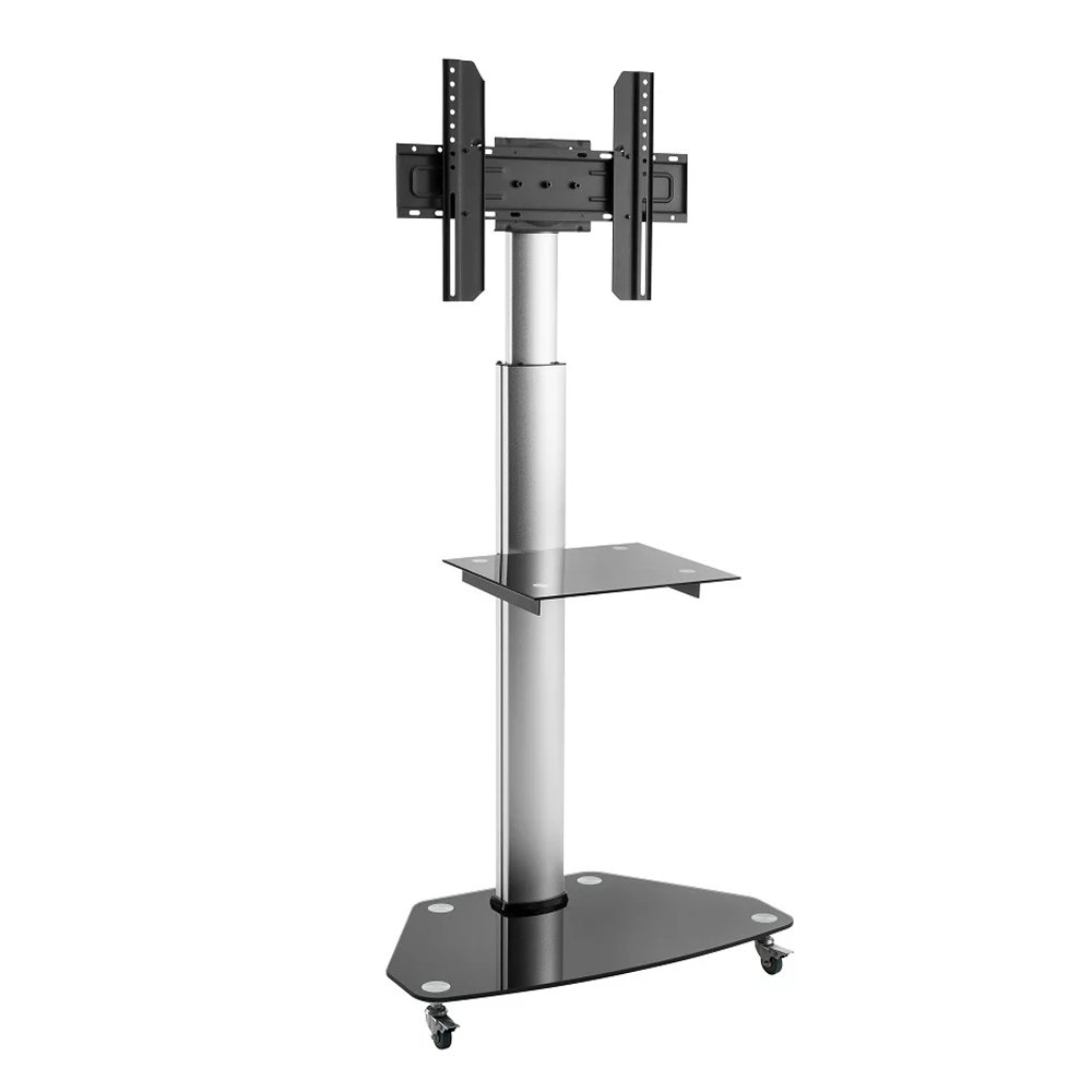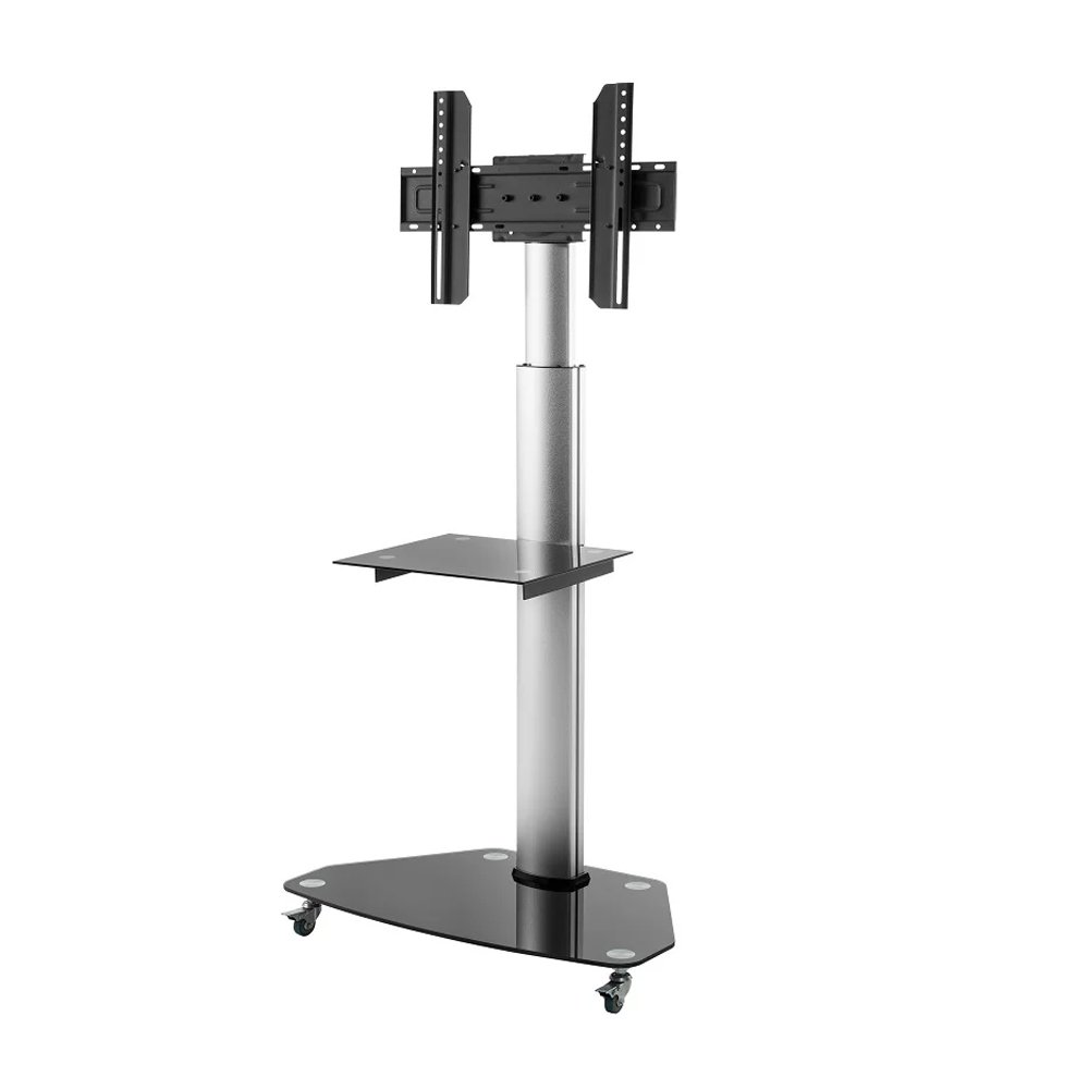 The SH 400FS Aluminium & Glass TV Cart offers a complete solution by serving a variety of projection needs for businesses, schools, and other organizations. The versatile presentation carts allow you to hold meetings with AV support or simply to display information. The telescoping height column with cable management organizes cables for a clean look. It is also equipped with a height-adjustable glass shelf for accessories. The solid TV mount supports flat-panel displays up to 40kg/88lbs and allows tilting for 45°up effortlessly. With 2 locking and 2 non-locking heavy-duty casters, it can be used as a mobile display cart or static stand.