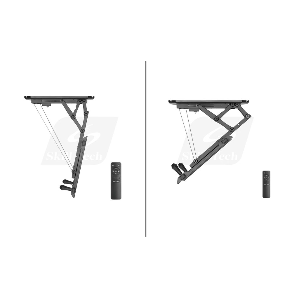 Skill Tech SH M5406R Motorized Flip Down TV Ceiling Mount is the perfect choice to saves space for the room with low ceiling (flat and pitched) - retracts and keeps flush to the top. Best of all, combined with the balanced mechanism to stop TV shaking on the ceiling. Quality motor holds TVs up to 75” (35 kg/77lbs) and provides automatic flip up and down function with the press of a button. The convenient RF remote allows operation through walls and from greater distances. Keyhole pattern allows for easy installation and height-adjustment.