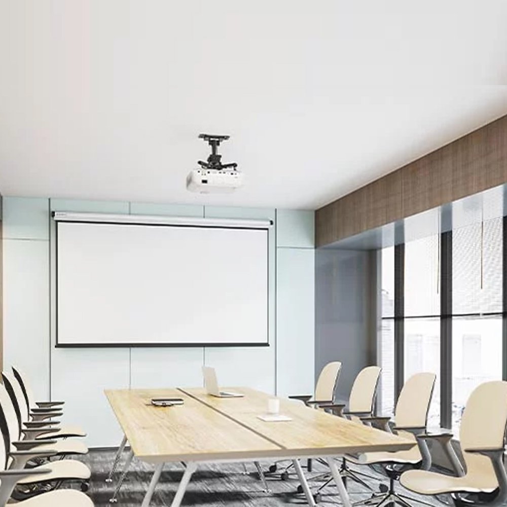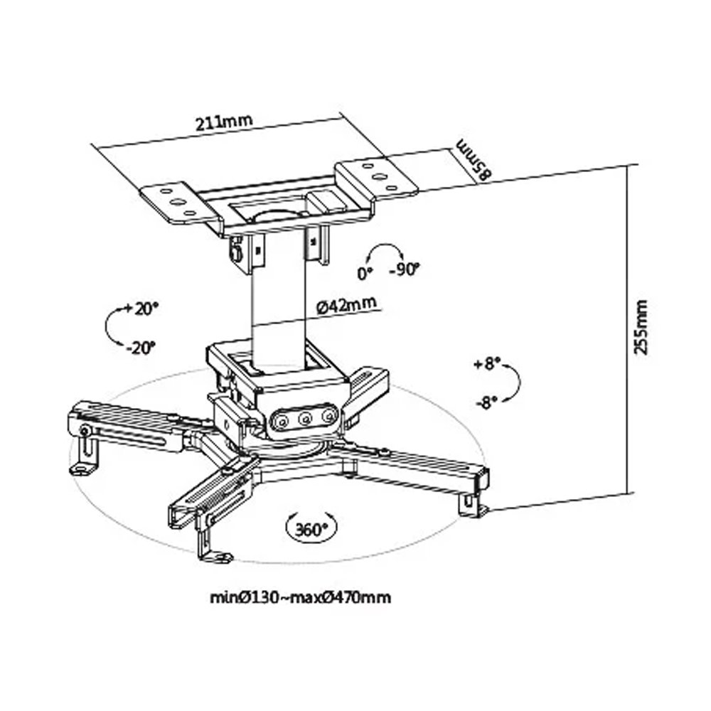The SH 07PB Solid Ceiling Projector Bracket is a reliable and sturdy mounting solution designed for projectors in various settings. Crafted from high-quality steel and plastic materials and coated with a durable matte white powder finish, this bracket offers a sleek and professional look.With dimensions measuring 470x470x255mm, this projector bracket provides ample space and flexibility for mounting your projector securely. It boasts a substantial weight capacity of 45kg, ensuring it can support a wide range of projector models. The mounting range, spanning from 130mm to 470mm, offers versatile positioning options, allowing you to achieve the ideal projection angle and distance from the ceiling.This projector bracket features extensive adjustability features, including a tilt range of +20° to -20°, a swivel range of +8° to -8°, and a rotation capability of +180° to -180°. These adjustments provide precise control over the projection angle and orientation, enabling you to align the projector perfectly with your screen or surface.The bracket's extension range of 255mm allows for flexible placement, accommodating various room configurations and projection distances. Installation is hassle-free due to its ceiling-mounted design, and the integrated cable management system helps keep your setup organized and free of clutter.