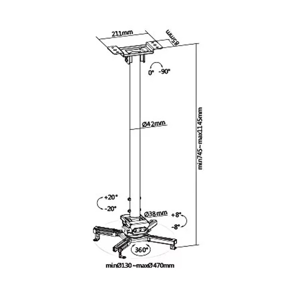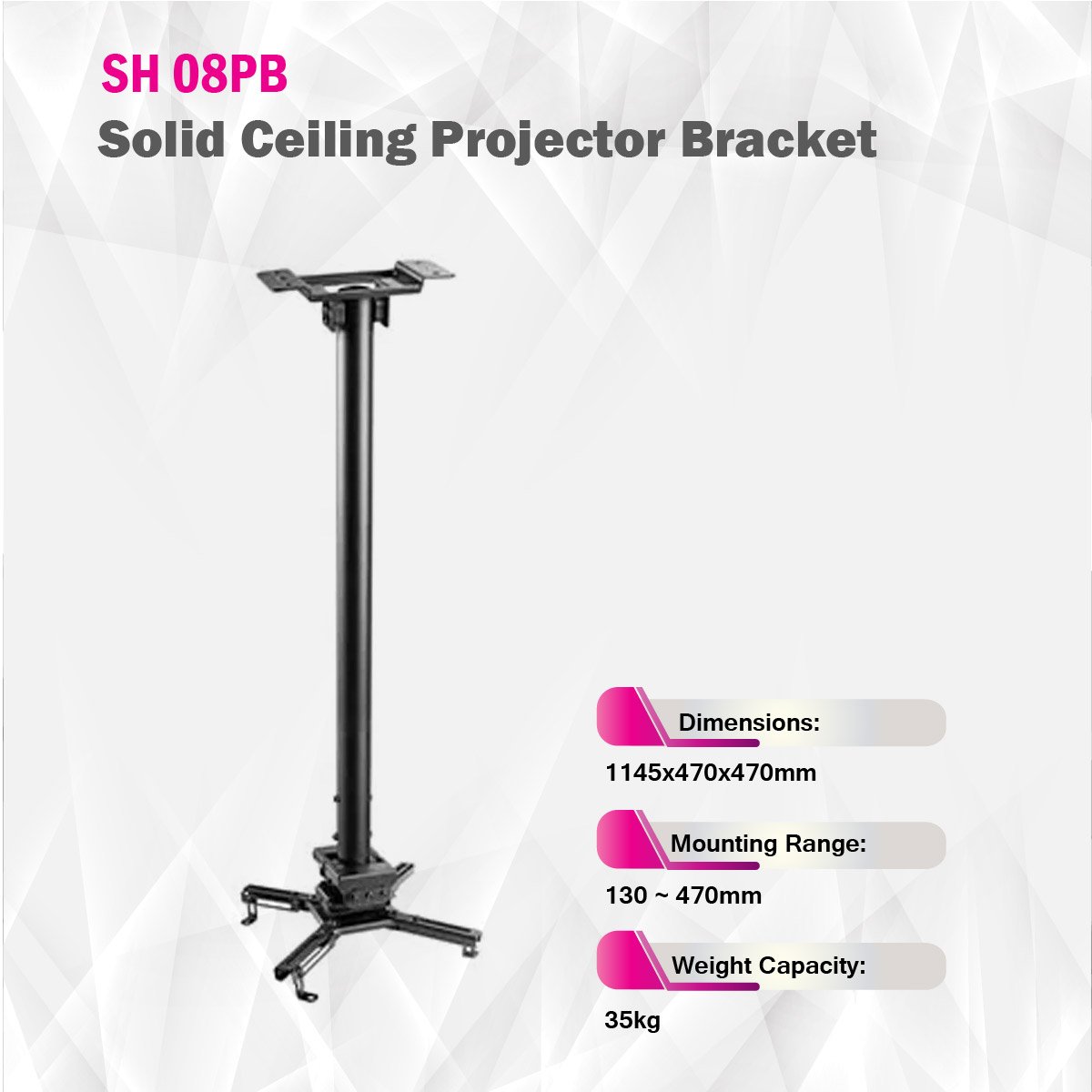 The SH 08PB Solid Ceiling Projector Bracket is a dependable and practical solution for mounting projectors, designed for a seamless integration into various environments. Crafted from sturdy steel and plastic materials and coated with a professional matte white powder finish, this bracket offers durability and a sleek appearance.With dimensions measuring 1145x470x470mm, this projector bracket provides ample space and stability for secure projector mounting. It boasts a robust weight capacity of 35kg, accommodating a wide range of projector models. The mounting range from 130mm to 470mm allows for flexible positioning, enabling variable projection distances from the ceiling.This projector bracket offers extensive adjustment capabilities, ensuring precise projection angles. It features a tilt range of +20° to -20°, a swivel range of +8° to -8°, and a rotation capacity of +180° to -180°. These adjustments provide flexibility in aligning the projector accurately with the screen or surface, enhancing the viewing experience.