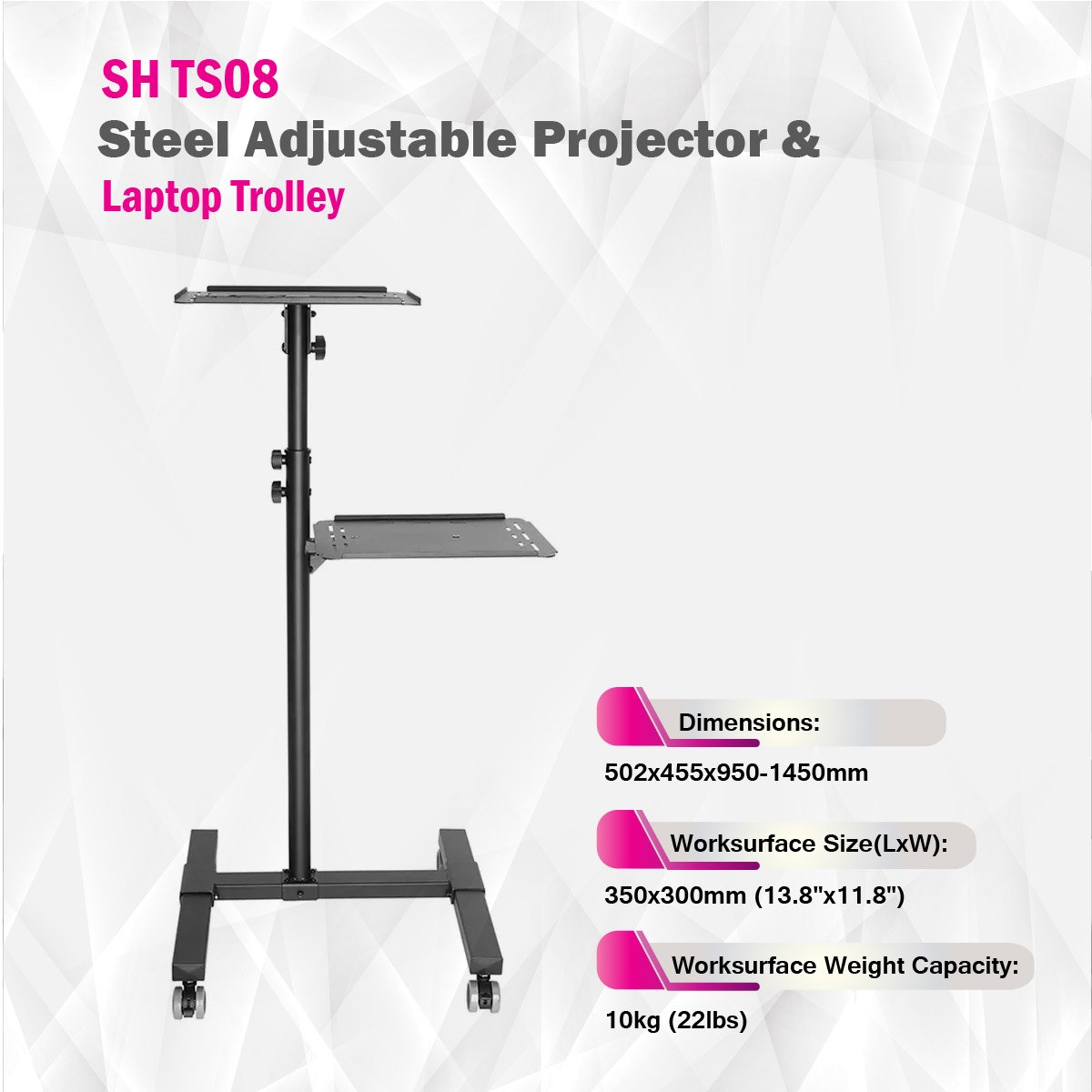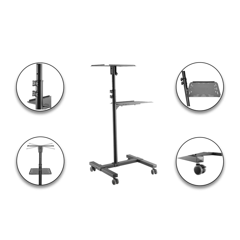 This height adjustable trolley is a very versatile unit with a large surface to hold projector, laptop, mouse, cup, books and more. Upper shelf can be tilted 12° up and 12° down to optimize best angle, while raised edge keeps your device from sliding off. Movable design with four casters offers extra stability