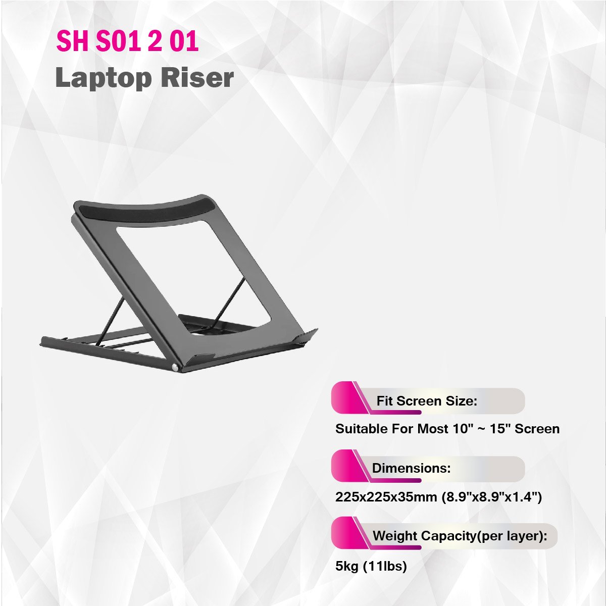 The SHS01 2 01 laptop riser is an economical solution designed to enhance your laptop experience. Crafted from sturdy steel with a matte black powder coating, it offers durability and a sleek appearance. With dimensions of 225x225x35mm (8.9"x8.9"x1.4"), this laptop riser is suitable for most laptops with screen sizes ranging from 10" to 15".Despite its compact size, each layer of the riser has a weight capacity of 5kg (11lbs), providing stability for your laptop. The minimalist design ensures it seamlessly fits into your workspace without taking up too much room.This laptop riser does not come with an accessory kit package, keeping it simple and straightforward for your convenience. It's an ideal choice for those looking for an affordable and practical way to elevate their laptop for better ergonomics and improved viewing angles.