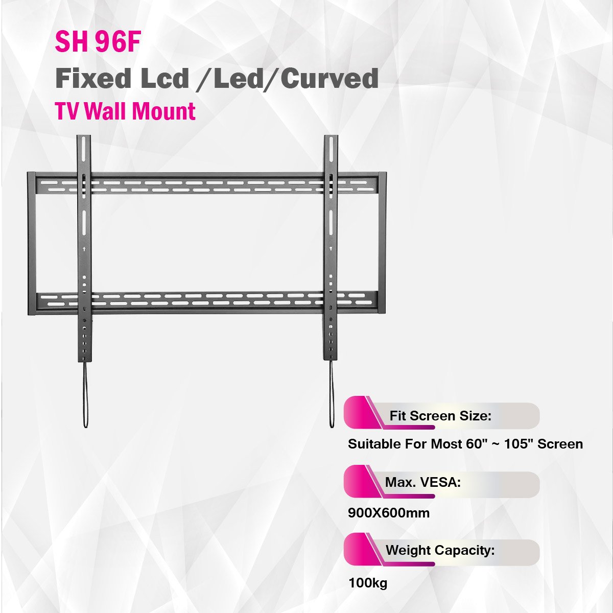 Introducing the SH 96F Fixed Lcd /Led/Curved TV Wall Mount, a standard rank product designed to securely mount your television to the wall. Made from durable steel and finished with a sleek matte black powder coating, this wall mount is both sturdy and stylish. With dimensions of 1008×630x32 mm, it is suitable for most 60" ~ 105" screens and is compatible with both LCD and LED TVs. Additionally, it is designed to fit curved TVs, making it a versatile option for any home theater setup. The mounting hole pattern is both VESA and universal, with VESA compatibility up to 900X600mm. The weight capacity of this wall mount is an impressive 100kg, and it has been strength tested and approved three times. The profile of the mount is a slim 32mm, and the panel type is detachable for easy installation. The wall plate type is fixed, ensuring a secure and stable mount for your television. Choose the SH 96F Fixed Lcd /Led/Curved TV Wall Mount for a reliable and stylish solution to your TV mounting needs.