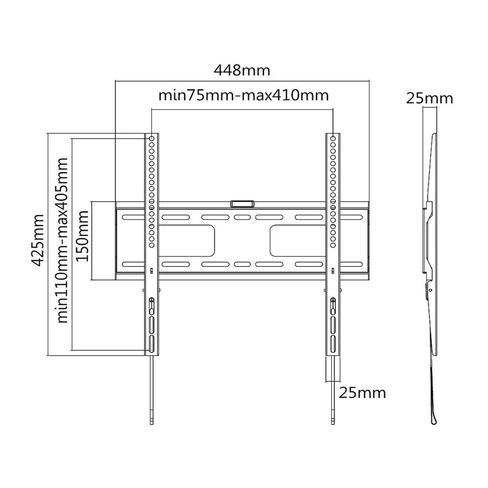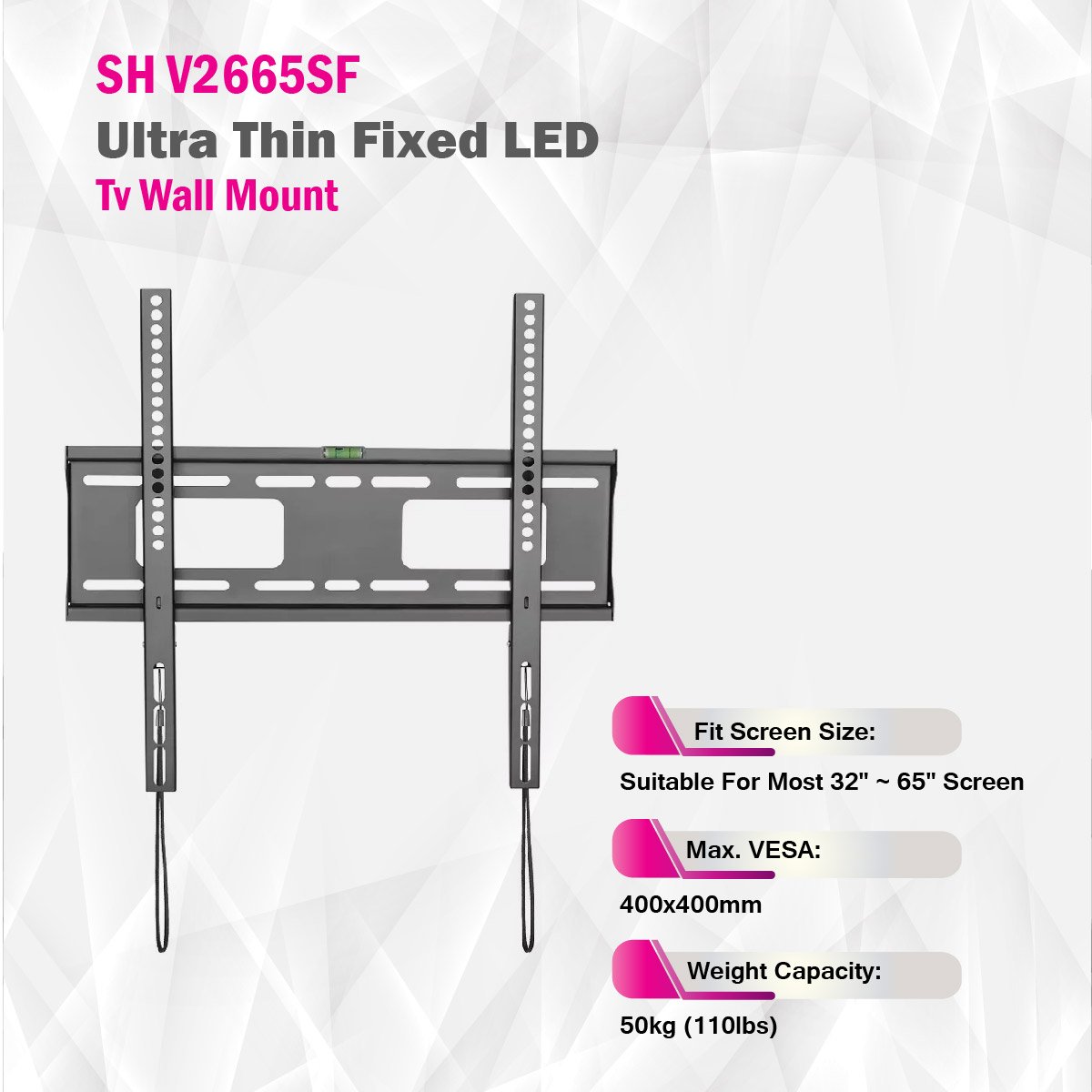 Introducing the SH V2665SF Ultra Thin Fixed LED TV Wall Mount, a standard rank product designed for solid wall and double stud installation. Made of high-quality steel and plastic, this wall mount is built to last with a bracket arm thickness of 1.5mm cold-rolled sheet and a wall plate thickness of 1.5mm cold-rolled sheet. The matte black powder coating finish adds a sleek touch to your home entertainment setup. Suitable for most 32" to 65" screens, this wall mount is VESA and universal compatible with a maximum VESA of 400x400mm and a weight capacity of 50kg (110lbs). The included hook-on bubble level ensures easy and accurate installation.