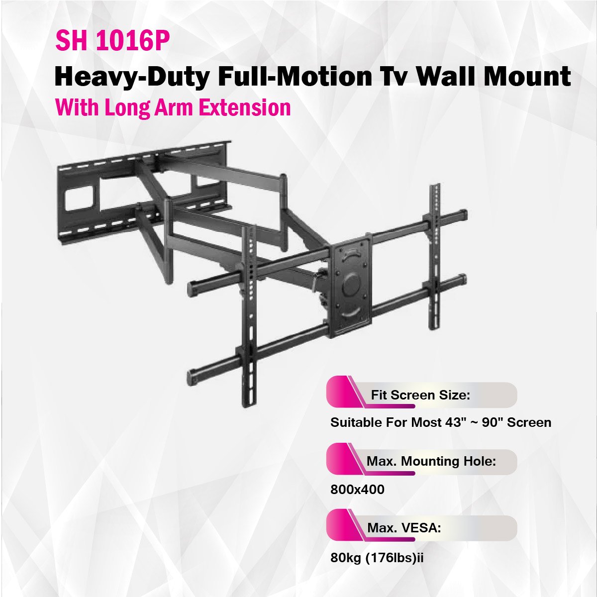 The SH 1016P Heavy-Duty Full-Motion TV Wall Mount with Long Arm Extension is a robust and versatile mounting solution for your TV. Built with high-quality steel and featuring a durable powder-coated finish in fine texture black, this wall mount is designed to last. It accommodates a wide range of TV sizes, suitable for screens from 43 to 90 inches, including curved TVs. The mounting hole pattern supports VESA standards, with compatibility for sizes such as 200x200, 300x200, 400x200, 300x300, 400x300, 400x400, 600x400, and 800x400mm, with a maximum mounting hole size of 800x400mm.With a remarkable weight capacity of 80kg (176lbs), this wall mount has undergone rigorous strength testing, receiving approval three times over to ensure the safety of your TV. The adjustable profile ranges from 69mm to 1044mm (2.7"~41.1"), allowing you to achieve the perfect viewing height and customize the placement according to your preferences. It offers a tilt range of +5° to -15°, enabling you to adjust the screen angle for an optimal viewing experience. The impressive swivel range of +60° to -60° provides flexibility in positioning the TV at various angles, and the screen level feature, with a range of +3° to -3°, ensures precise alignment.This wall mount also supports screen freely tilting for added convenience. Installation options include solid wall and double stud (406mm/450mm/600mm), providing flexibility to suit your needs. The panel is detachable for easy setup, and the wall plate type is fixed for stability. Additional features include a direction indicator and cable management to keep your setup organized and a hook-on bubble level included in the components package for accurate installation. Elevate your home theater experience with this heavy-duty, long-arm extension TV wall mount.