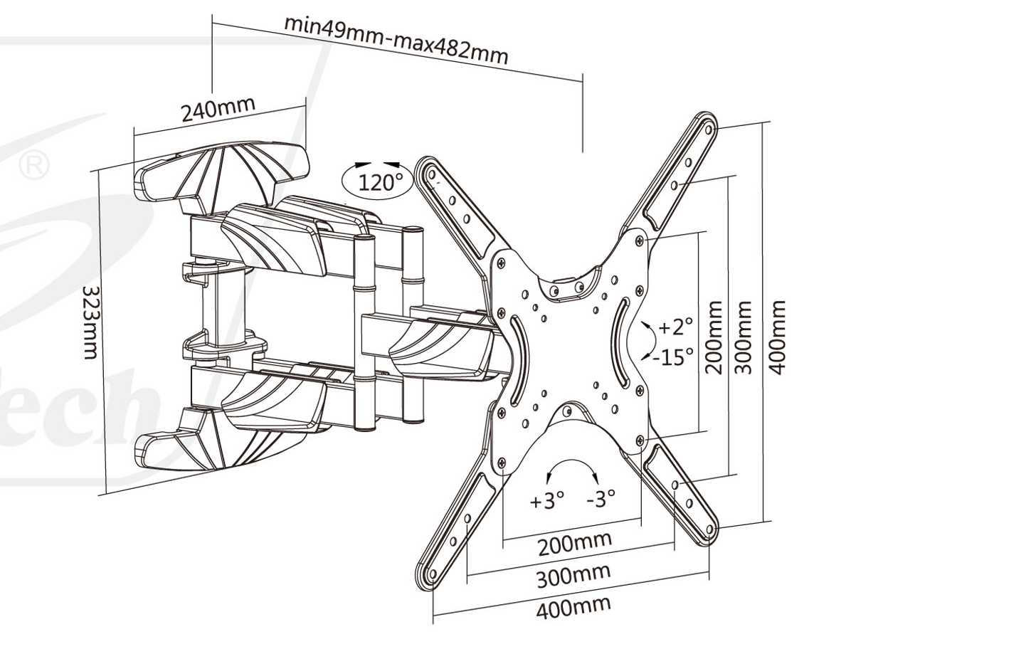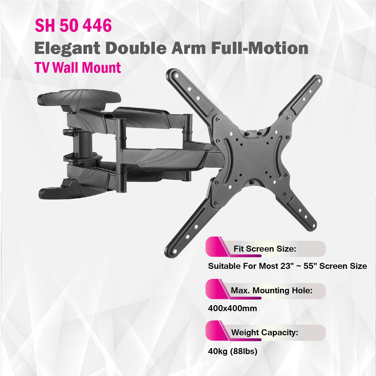 The SH50 446P is an Elegant Double Arm Full-Motion TV Wall Mount designed for standard-sized TVs, offering both style and functionality. With dimensions of 435x435x482mm (17.1"x17.1"x19"), it's compatible with most 23 to 65-inch screens, making it a versatile choice for various room sizes. Constructed from steel and plastic materials, this wall mount ensures durability and reliability.It features VESA compatibility, supporting various mounting hole patterns, including 200x100, 200x200, 300x300, 400x200, 400x300, and 400x400mm, with a maximum VESA size of 400x400mm. The mount can accommodate TVs with a weight capacity of up to 40kg (88lbs).The profile of the SH50 446 ranges from 49mm to 482mm (1.9" to 19"), allowing you to achieve the desired distance between the TV and the wall. It offers a tilt range of +2° to -15°, enabling you to adjust the screen's angle for optimal viewing comfort. Additionally, it provides a swivel range of +60° to -60°, offering flexibility in positioning your TV to achieve the perfect viewing angle.This wall mount is designed for easy installation and includes both VESA and universal mounting options. Its elegant design and functionality make it an excellent choice for those seeking a stylish and reliable solution to mount their TVs securely and customize their viewing experience.