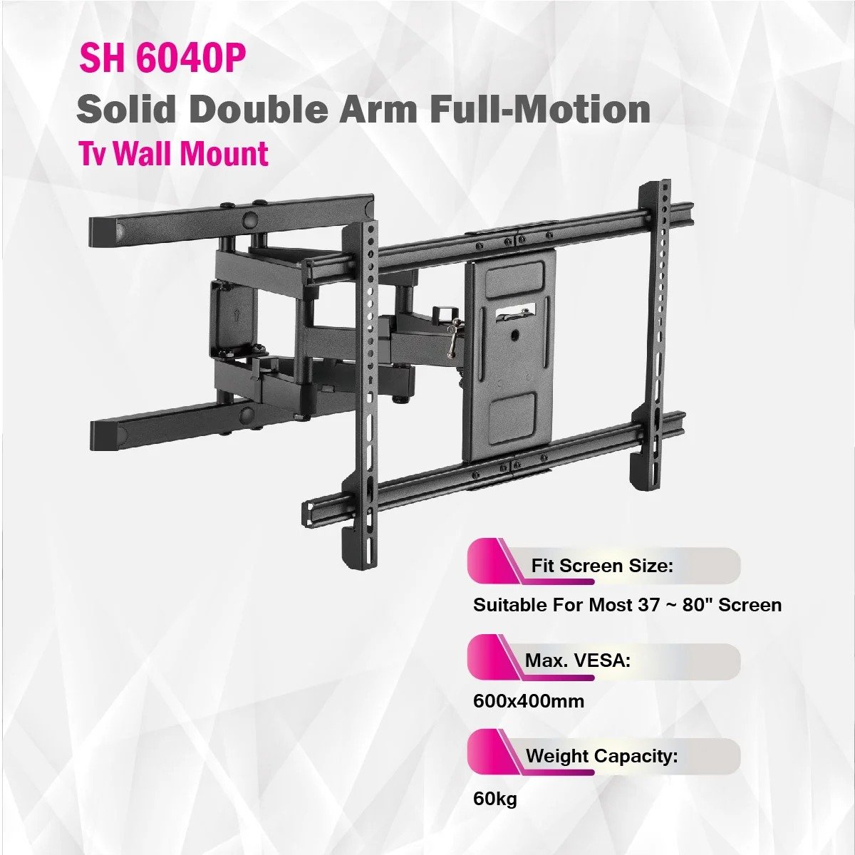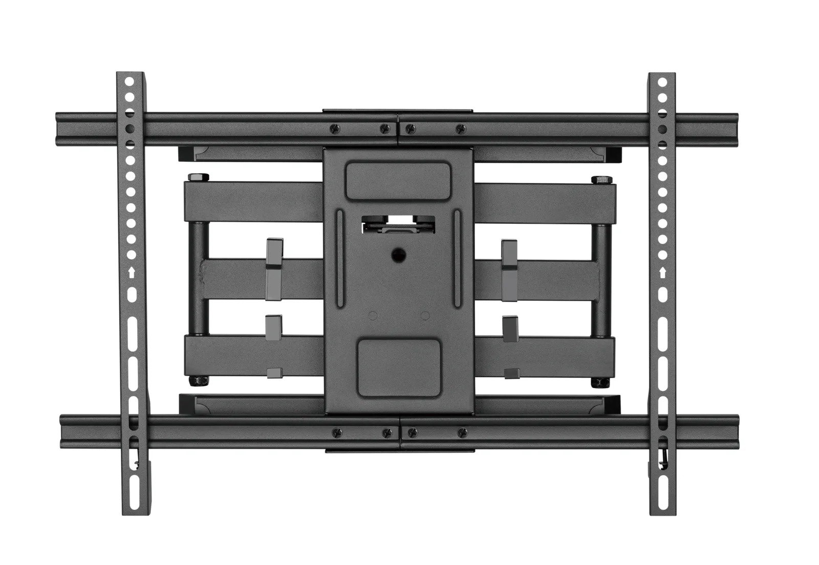The Full-Motion TV Wall Mount, designed for screens ranging from 37 to 80 inches, is a standard rank wall mount known for its durability and versatility. Constructed from robust steel and plastic materials, it features VESA compatibility, accommodating various mounting hole patterns such as 200x200, 300x200, 300x300, 400x200, 400x300, 400x400, and 600x400mm, with a maximum VESA size of 600x400mm. With a weight capacity of 60kg and strength tested and approved four times, this mount ensures the safety and stability of your TV.The profile of the mount ranges from 77mm to 428mm, allowing for flexibility in positioning your TV closer to the wall or extending it for optimal viewing angles. It offers a tilt range of +3° to -15°, enabling you to adjust the screen to your preferred angle. The swivel range of +60° to -60°, combined with a screen level feature with a range of +3° to -3°, further enhances your viewing experience.Installation options include solid wall or single stud mounting, and the mount features a detachable panel for ease of setup. The wall plate type is fixed, ensuring stability. The mount's design incorporates cable management, maintaining a clean and organized appearance. In addition, it doesn't come with a bubble level but includes a direction indicator to assist you in aligning your TV correctly during installation. Overall, this Full-Motion TV Wall Mount is a reliable choice for those seeking a versatile and sturdy mounting solution for their TV.