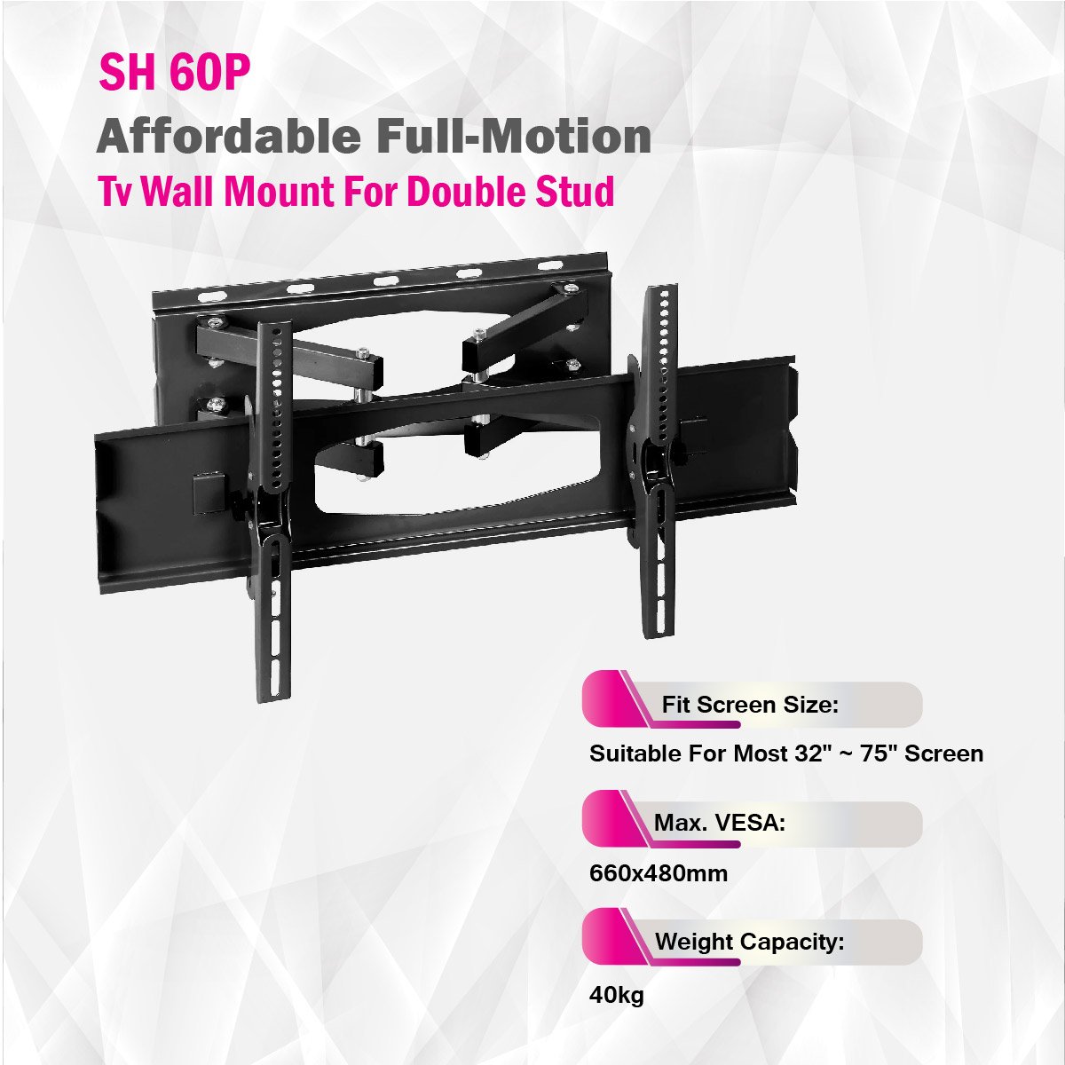 The SH 60P is an affordable Full-Motion TV Wall Mount designed for double-stud installations, offering a budget-friendly solution for accommodating most 32 to 75-inch screens, including curved TVs. Constructed from sturdy steel material with a fine texture black powder coating, it provides durability and a sleek appearance.This wall mount boasts VESA compatibility, supporting various mounting hole patterns such as 200x200, 300x300, 400x200, 400x400, and 600x400, with a maximum VESA size of 660x480mm. It offers a substantial weight capacity of 40kg, ensuring the secure mounting of your TV.The profile ranges from 120mm to 520mm, allowing you to achieve the desired distance between the TV and the wall. The mount provides a tilt range of +5° to -15°, enabling you to adjust the screen's angle for optimal viewing. It also features an impressive swivel range of +60° to -60°, along with a screen level adjustment of +3° to -3°, providing flexibility to find the perfect viewing position.Installation is versatile, with options for double stud and solid wall mounting, and it includes a detachable panel for ease of setup. The wall plate type is fixed, ensuring stability and reliability. In summary, the SH 60P Full-Motion TV Wall Mount offers an affordable solution for those seeking a reliable and flexible mounting option for their mid to large-sized TVs