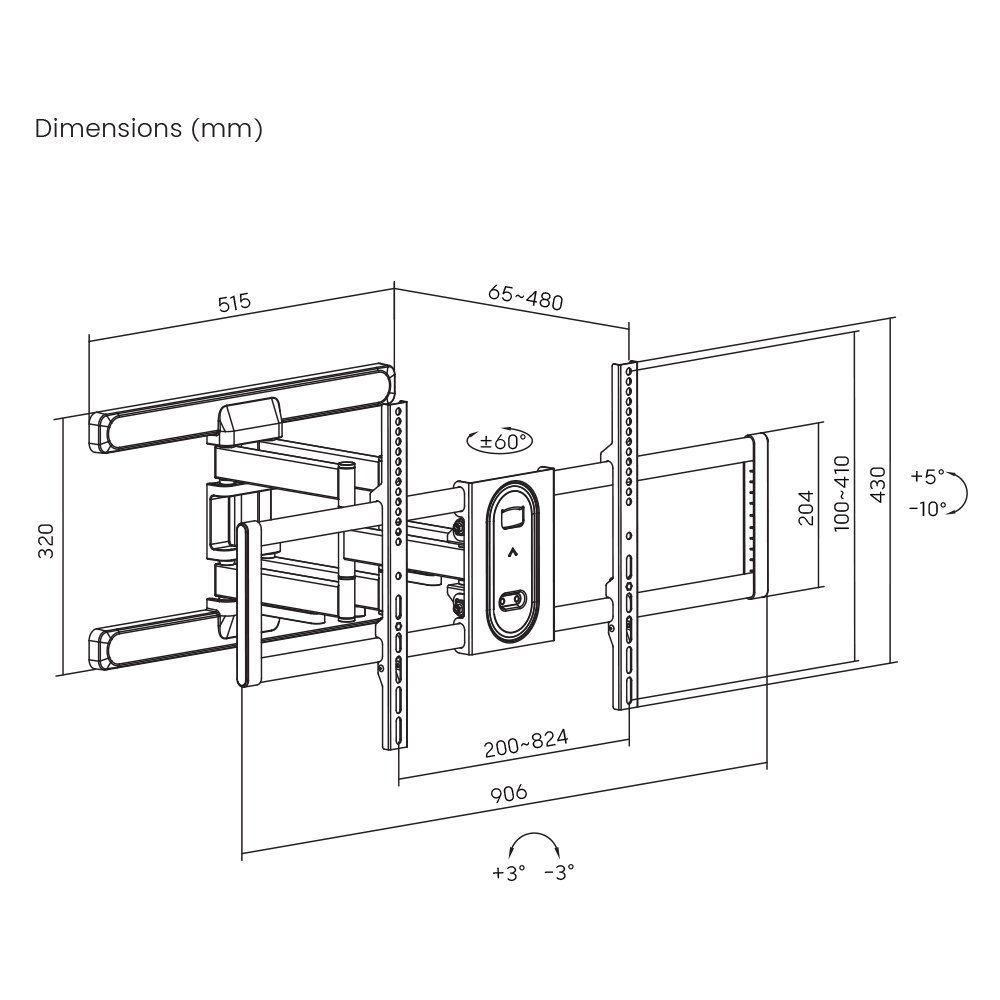 Metal Sheet Thickness: Bracket Arm THK=1.5mm pickling sheet,VESA Panel THK=1.8mm cold-rolled sheet,Wall Plate THK=3mm pickling sheet (Bracket Arm THK=0.059" pickling sheet,VESA Panel THK=0.071" cold-rolled sheet,Wall Plate THK=0.12" pickling sheet)