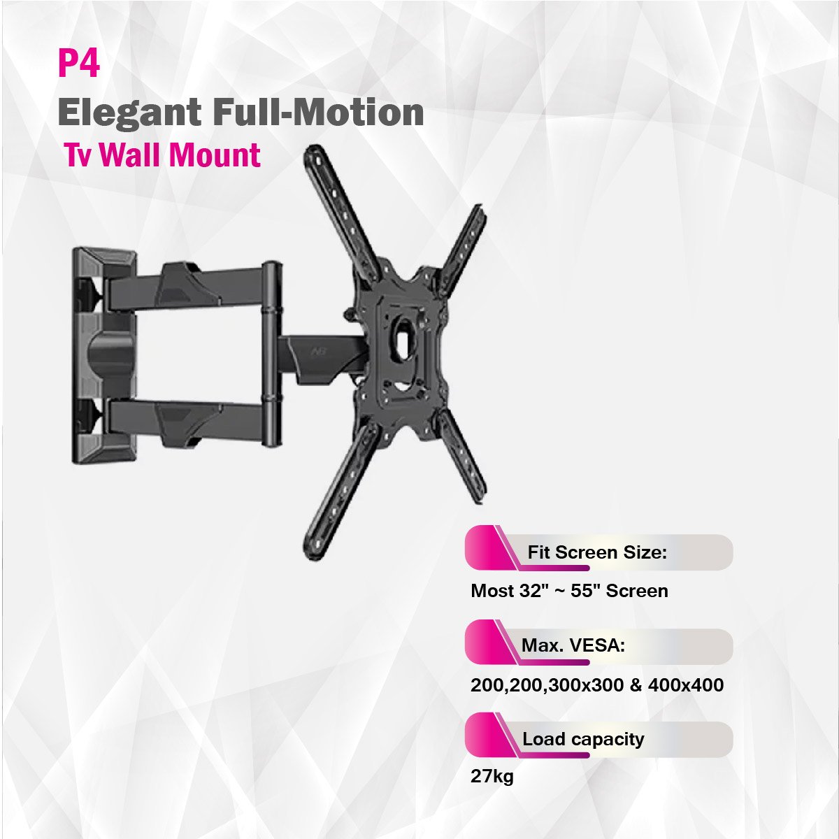 The P4 Elegant Full-Motion TV Wall Mount combines both style and functionality to elevate your home entertainment experience. Crafted from a sturdy blend of steel and plastic materials with a sleek powder coating finish, this wall mount not only ensures durability but also adds an elegant touch to your living space. Designed to accommodate most 32 to 55-inch screens, it supports a range of VESA patterns, including 200x200, 300x300, and 400x400mm, guaranteeing compatibility with a variety of TV brands and models. With a load capacity of 27kg and having undergone rigorous strength testing three times, this wall mount offers secure and dependable support for your TV. The adjustable profile allows for a customizable viewing experience, with a range spanning from 50 to 400mm, ensuring the ideal placement and height. You can fine-tune your viewing angle with a tilt range of +8° to -5° and a swivel range of +90° to -90°, while the screen level can be adjusted from +4° to -4° for precise positioning. The cable management system helps keep your cables organized and hidden, contributing to a clean and clutter-free setup. The P4 Elegant Full-Motion TV Wall Mount is a standard-grade option that combines aesthetics with practicality, making it an excellent choice for enhancing your home entertainment setup.