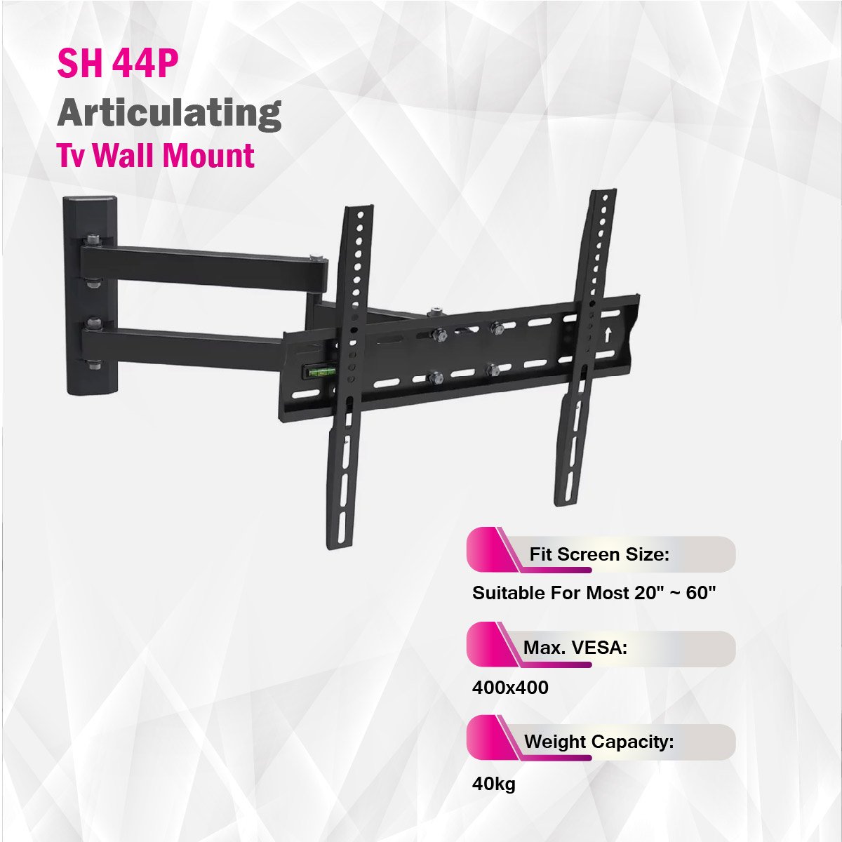 The SH 44P Articulating TV Wall Mount offers an affordable and versatile solution to enhance your home entertainment setup. Crafted from a combination of steel and plastic materials with a matte black powder coating, this wall mount provides durability and a modern appearance. It is designed to accommodate a wide range of screen sizes, from 20 to 55 inches, including curved TVs, making it suitable for various television models. The mount supports VESA patterns including 75x75, 100x100, 200x100, 200x200, 300x300, and 400x400mm, with a maximum VESA size of 400x400mm, ensuring compatibility with most TV brands. With a weight capacity of 40kg, it provides stable and secure support for your TV. The wall mount's profile can be adjusted from 110mm to 530mm, allowing you to customize the viewing height and placement to your preference. It offers a tilt range of +15° to -15°, providing flexibility in finding the perfect viewing angle. Installation options include solid wall and single stud mounting, and it includes a detachable panel, fixed wall plate, bubble level for easy and precise setup, and an accessory kit package in a convenient zip polybag. The SH 44P Articulating TV Wall Mount is an economical choice that combines functionality and affordability, delivering a reliable solution for your TV mounting needs.