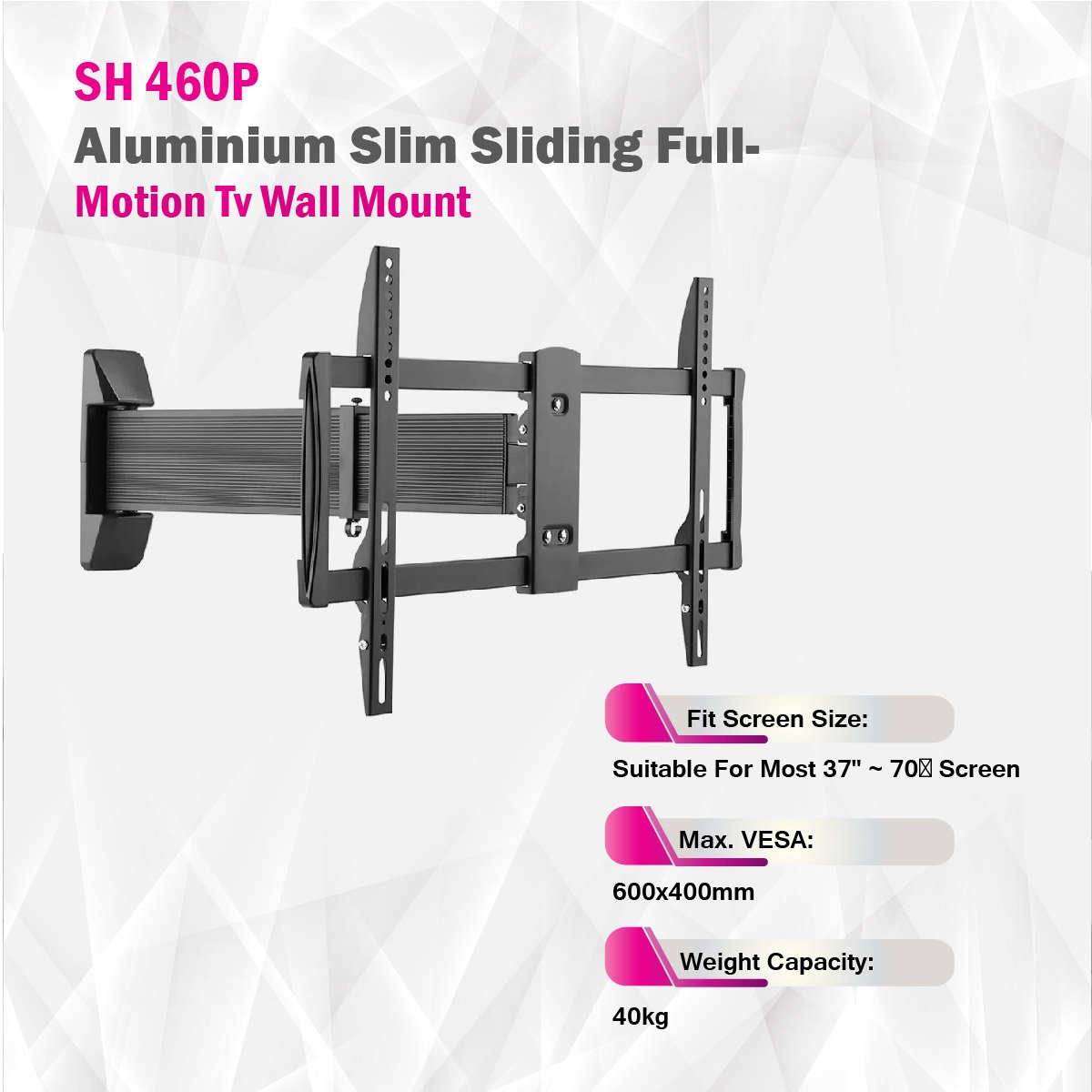 The innovative SH 460P Sliding full-motion mount places 37"-70" curved & flat panel TVs just 45 mm from the wall, yet still allows full-motion capabilities. It can support up to 40kgs/88lbs and has also passed a four-times weight test. This mount slides to extend out up to 680mm from the wall and allows a large TV to swivel left and right up to 90 degrees. Post-installation level adjustment allows the TV to “roll” up to 3º clockwise and counterclockwise to ensure it is perfectly level. The SH 460P always has a finished appearance with a decorative cover that conceals assembly and mounting hardware.