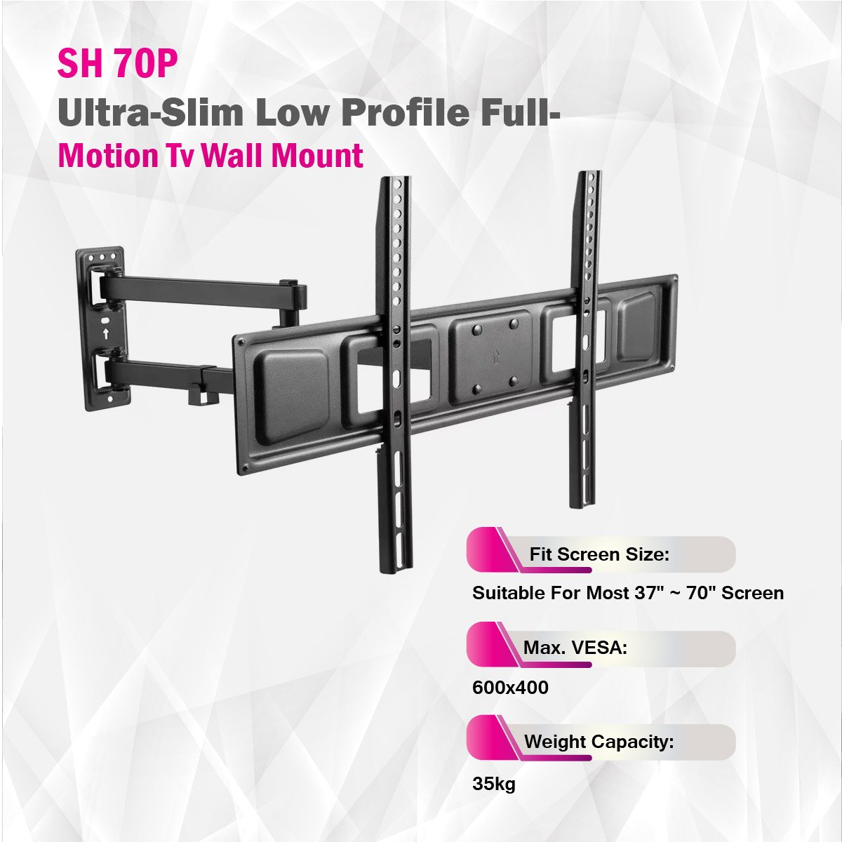 The SH 70P economical full-motion TV mount accommodates most 37"-70" flat-panel TVs up to 35kg/77lbs. Its full-motion capability allows a +10°~-15° tilting and a +90°~-90° swiveling of your TV, which maximizes the flexibility for easy viewing from different angles in the room. The +3°~-3° leveling adjustment ensures the TV is perfectly positioned, and the integrated cable clip keeps cables organized and protected.