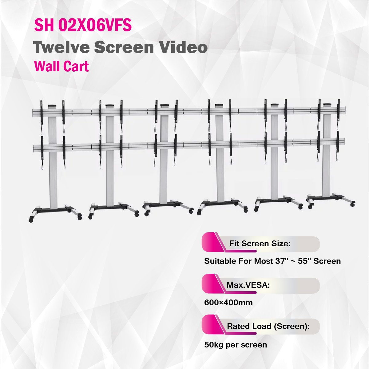 The SH 02X06VFS is a standard twelve-screen video wall cart designed for seamless multi-screen displays in various environments. Crafted from a robust combination of steel, aluminum, and plastic, this cart ensures durability and stability. Its powder-coated and oxidized surface finish not only enhances its visual appeal but also provides long-lasting protection against wear and tear.With a total height of 2232mm and dimensions measuring 4965x2232x750mm, this cart is tailored to accommodate most 37" to 55" screens. It supports multiple VESA patterns, including 200x200, 400x200, 300x300, 400x400, and 600x400mm, ensuring compatibility with a wide range of screens.The SH 02X06VFS can support up to twelve screens, arranged in a 2x6 configuration, with each screen having a maximum load capacity of 50kg. This configuration guarantees secure placement and stability for all screens. The cart offers a tilt range of +15° to -15°, enabling you to achieve optimal viewing angles for your displays.