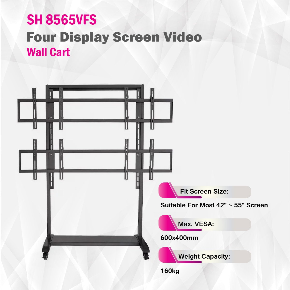 Skill Tech SH 8665VFS four-screen video wall stand provides an elegant presentation solution for most 42"-55" displays, allowing tool-free precise height adjustment, depth adjustment, and tilt adjustment for seamless display alignment. Best of all, we’ve made it easy for you to customize exactly what you need. Components are available separately, enabling you to create the exact solution for any application. All Mounting Hardware included.