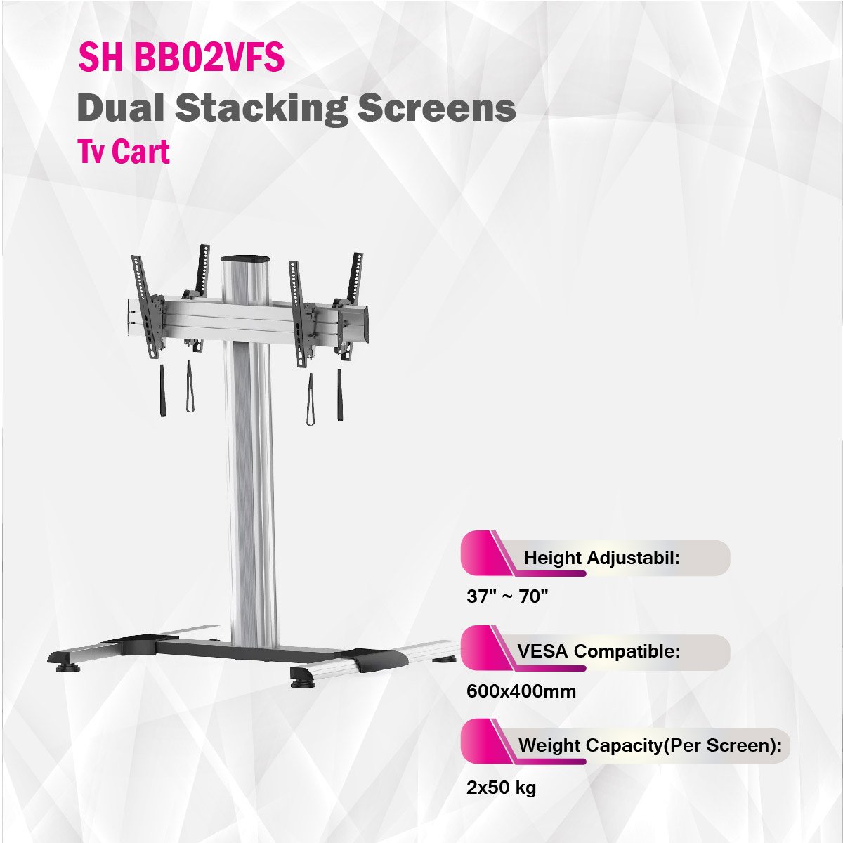 Unleash the power of dual screens with our versatile TV cart. [Your Brand Name]'s Dual Stacking Screens TV Cart offers a flexible and mobile solution for your multimedia needs. Effortlessly stack two screens, providing dynamic display options for presentations, events, or entertainment setups. Elevate your viewing experience with convenience and style. Explore the future of mobility with our Dual Stacking Screens TV Cart